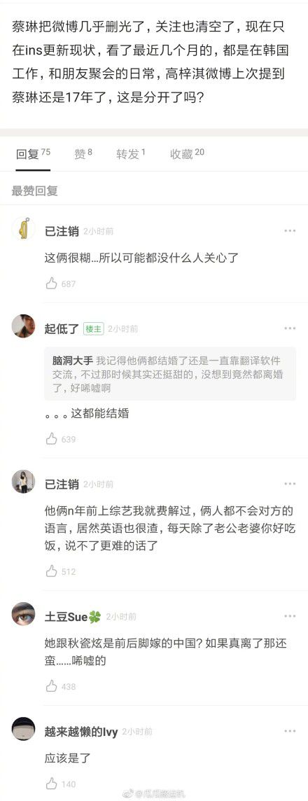 据韩国媒体报道,蔡琳删除了SNS微博账号的大部分内容,并清除了全部关注。据另一位知情人士透露,蔡琳与高梓淇已于去年年底离婚。对此蔡琳经纪公司发表官方立场否认与高梓淇离婚传闻,并表示“此前中国媒体报道的关于蔡琳的新闻,我们向蔡琳本人进行了确认,离婚一事完全不是事实。对于此事,虽然认为没有回应的价值,但是由于国内也进行了既定事实化的报道,因此为了纠正此事向各位传达官方立场。