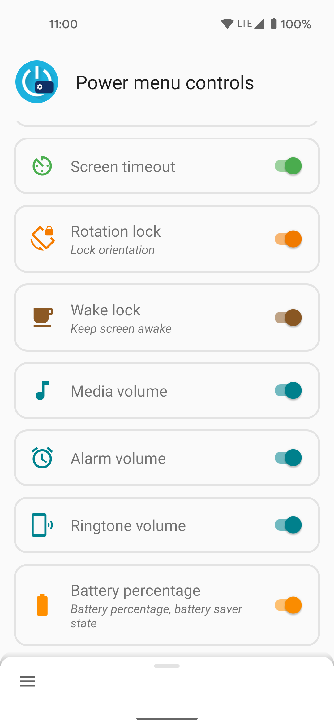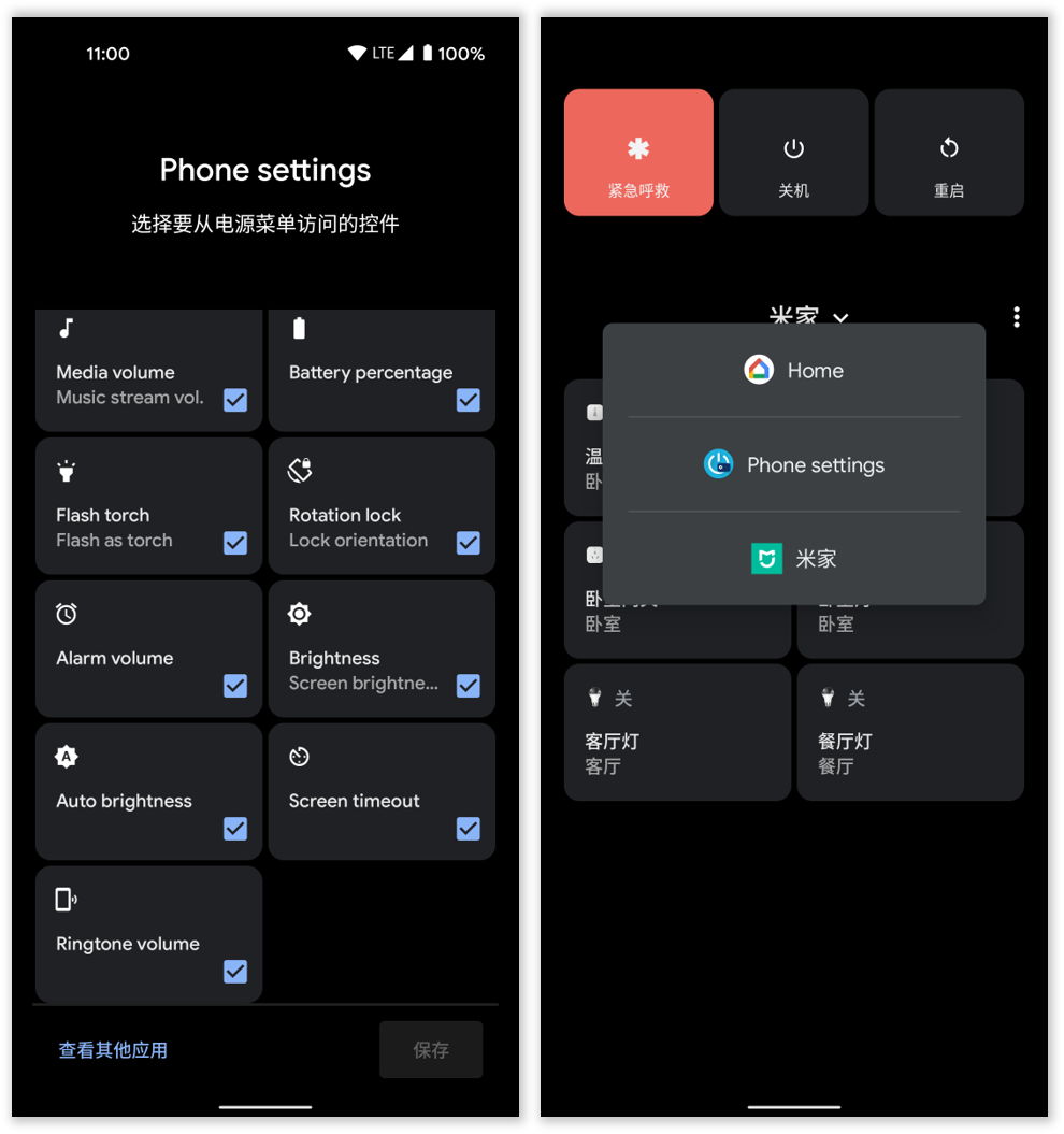 完成授权后,Power menu controls 就可以正常工作了。这里 Power menu controls 提供了三类开关:一类是自动亮度、手电筒、自动旋转这种原本位于通知中心上方「快捷设置」面板中的开关,一类是屏幕常亮这类在系统设置中并不会提供直接交互入口的实用功能,另外还有媒体/系统音量控制、屏幕超时设置等等在「快捷设置」面板中并不提供的系统设置选项。