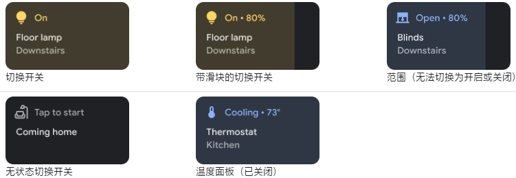 当然,我们之所以在本文标题中将 Power menu controls 称作是「Android 新特性的最佳实践」还有别的原因 —— Power menu controls 不仅在 Android 11「设备控制器」这一新功能的基础上进行了二次发挥,还完美适配了 Google 所给出的几种开关样式: