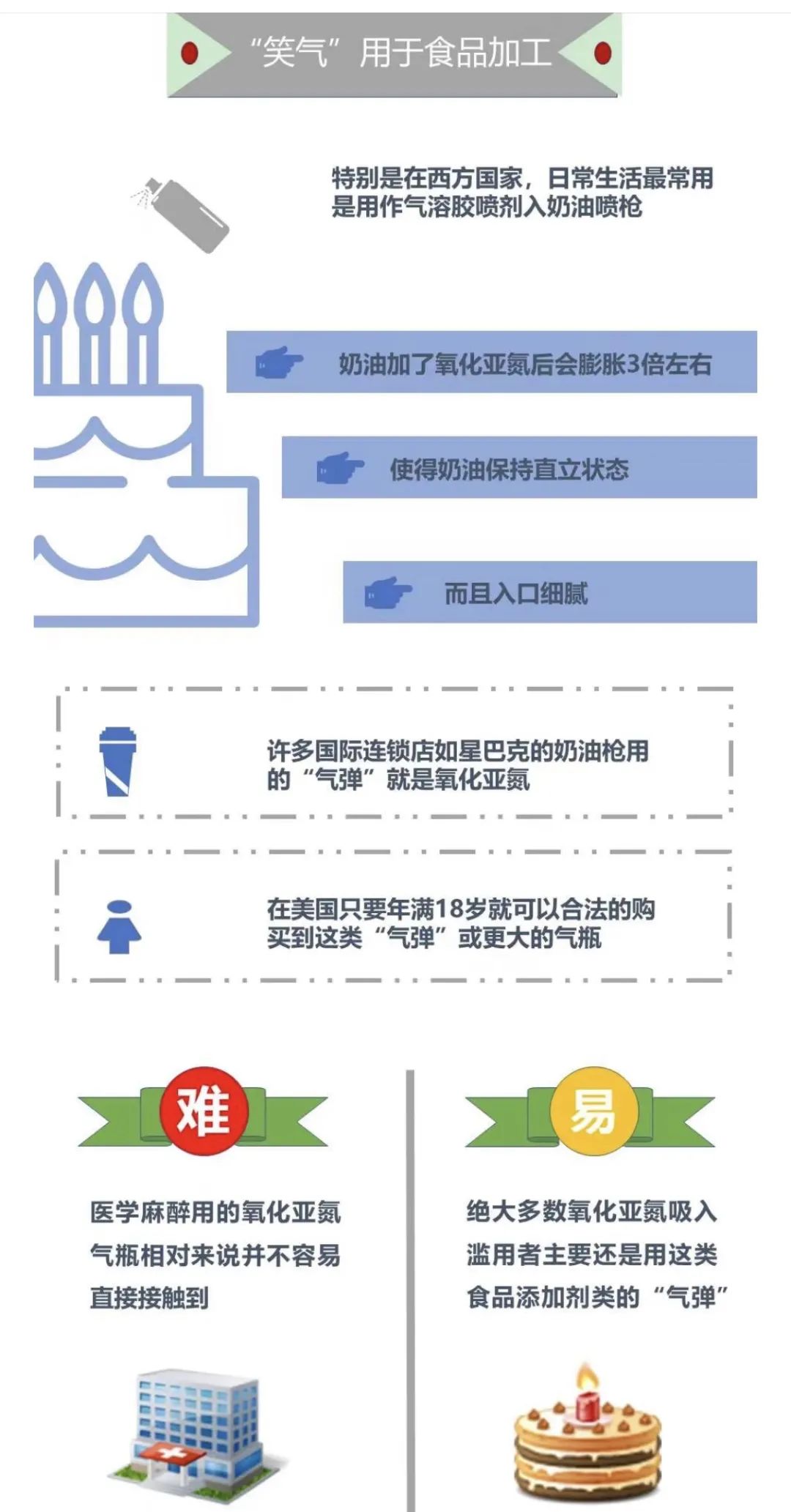 “笑气”属于国家管控的危险化学品,曾用于医学手术,在食品界用于发泡剂和密封剂。“笑气”进入血液后会导致缺氧,过量吸食过后对人体的危害极大,长期吸食会引起高血压、晕厥,甚至心脏病发作,还可引起贫血及中枢神经系统损害。对广大群众特别是青少年群体带来现实危害。