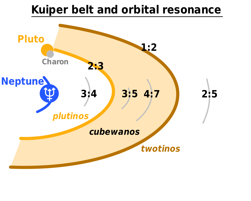 在这些间隔区域,物体对于海王星拥有一个1:2,2:3或3:4的共振比,意味着每当海王星完成两次公转时,这些天体会完成一次公转,或当海王星完成三次公转的时候,它们会完成两次,依此类推。由于冥王星是其中最大的星体,超过两百个已知存在的位于2:3共振比地带的小行星被成为冥族小行星。