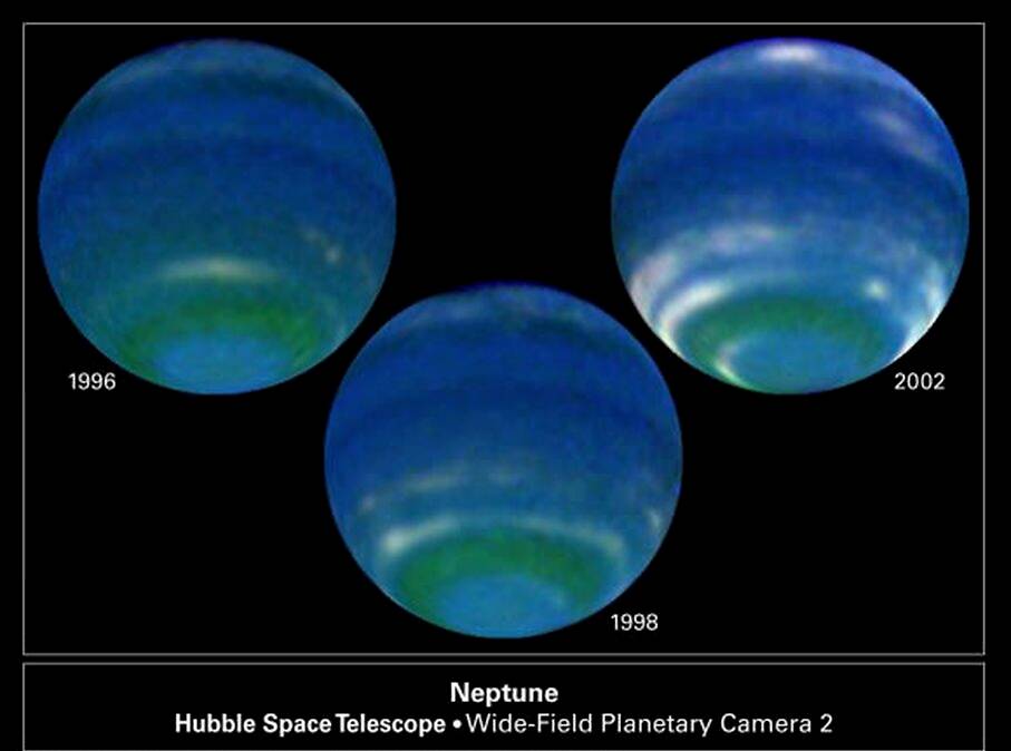 图解:哈勃望远镜拍摄的照片,展示了海王星南半球的季节变化。