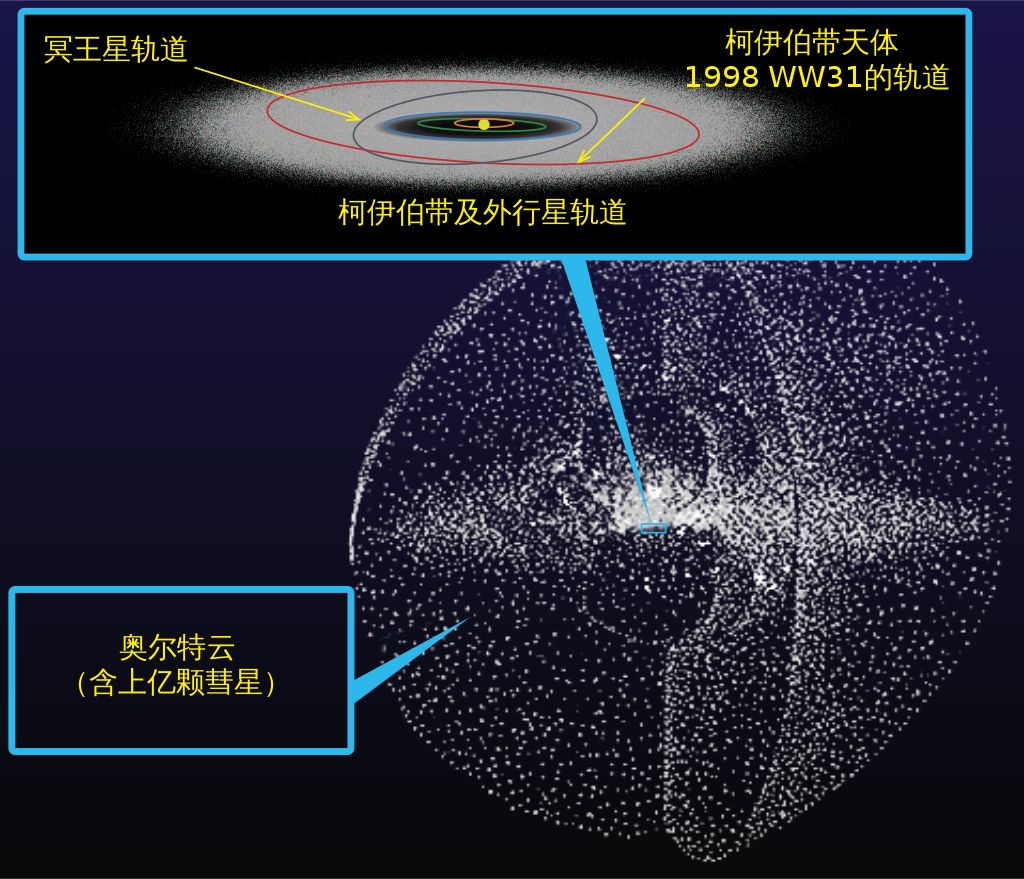 2.以彗星轨道 在冥王星轨道之外,还有天体绕太阳运动。它们是彗星。我们已经识别了两个彗星类别。一个是柯伊伯带( Kuiper Belt)、一个是奥尔特云(Oort Cloud)。奥尔特云的半径更大,大约为50,000AU(约7.5x1012 km)。如你所见,彗星要比行星距离太阳远得多。