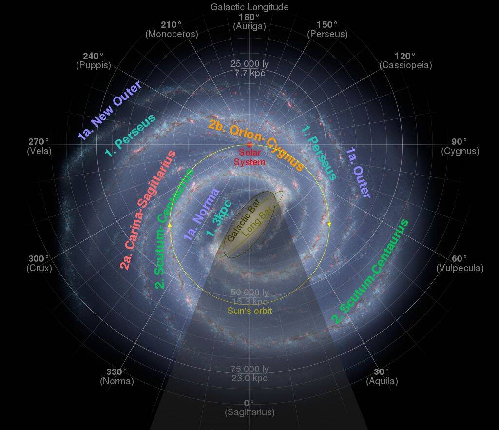 图解: 太阳系在银河系内的位置,以黄色的箭头标示。