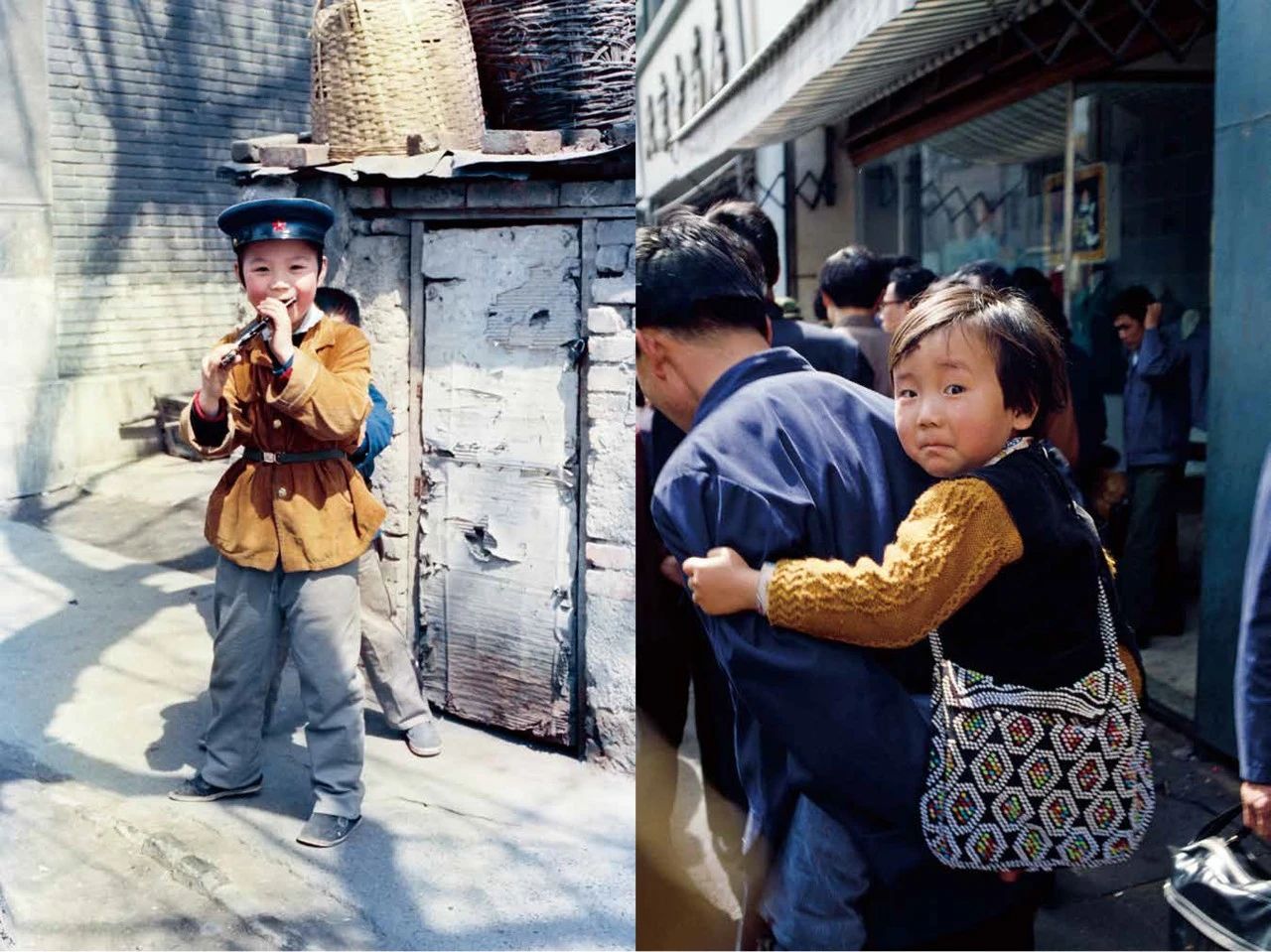 △ 北京,1980年,两个小男孩,一个躲着镜头,另一个拿着玩具枪。(图左)