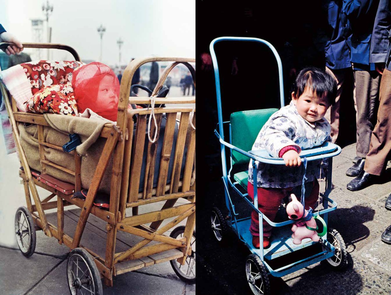 △ 北京,1980年,小孩坐在竹制的婴儿车里。(图左)