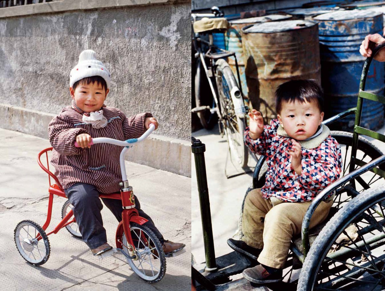 △ 北京,1980年,有一辆新玩具三轮车的小男孩。他的父母可能是存了很长时间的钱给他买了新三轮车。(图左)