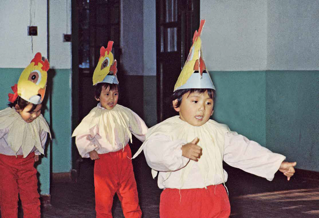 △ 北京,1980年,戴着小鸡帽子的孩子们在幼儿园跳舞,他们玩得很开心。