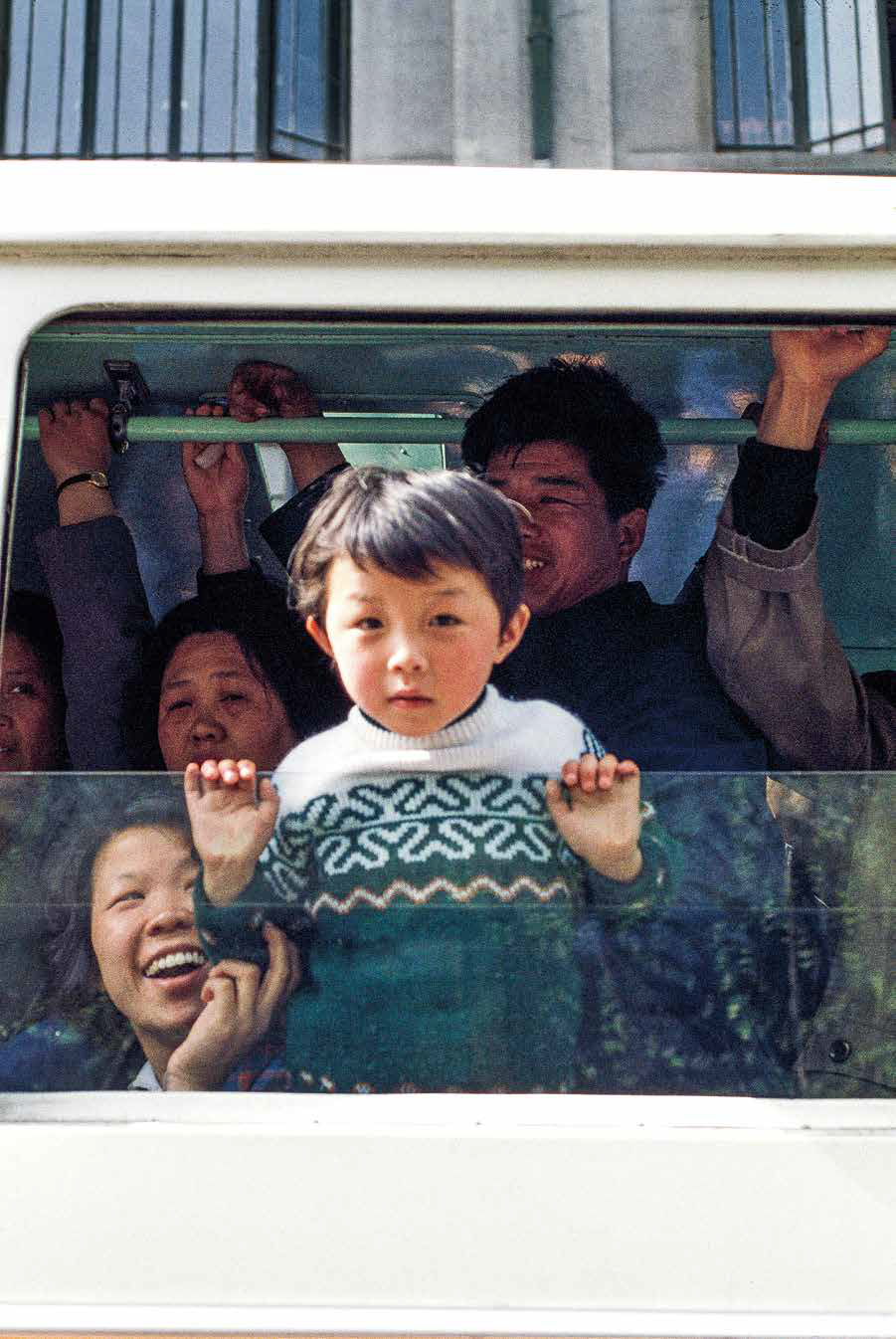 △ 上海,1980年3月,一个小男孩在公共汽车上被照相机吸引了。他的母亲在后面微笑。多么亲密的关系!