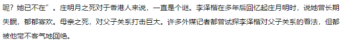 除了这本书以外,母亲去世后李泽楷对李嘉诚的态度转变其实也能反映一些问题:庄月明离世没几天,李泽楷便以工作不便为由从家中搬出,后来有段时间甚至宁可住在酒店也不愿意回家——