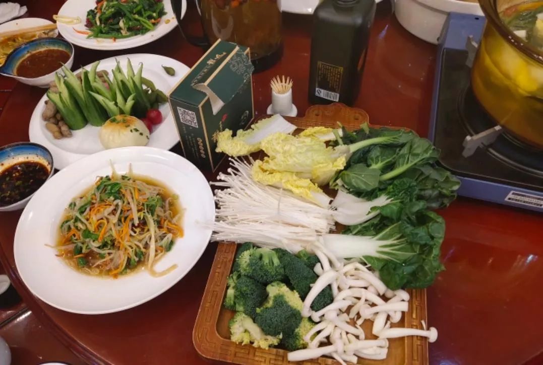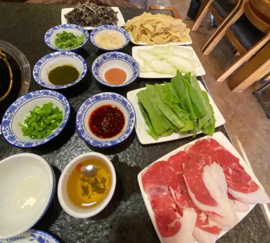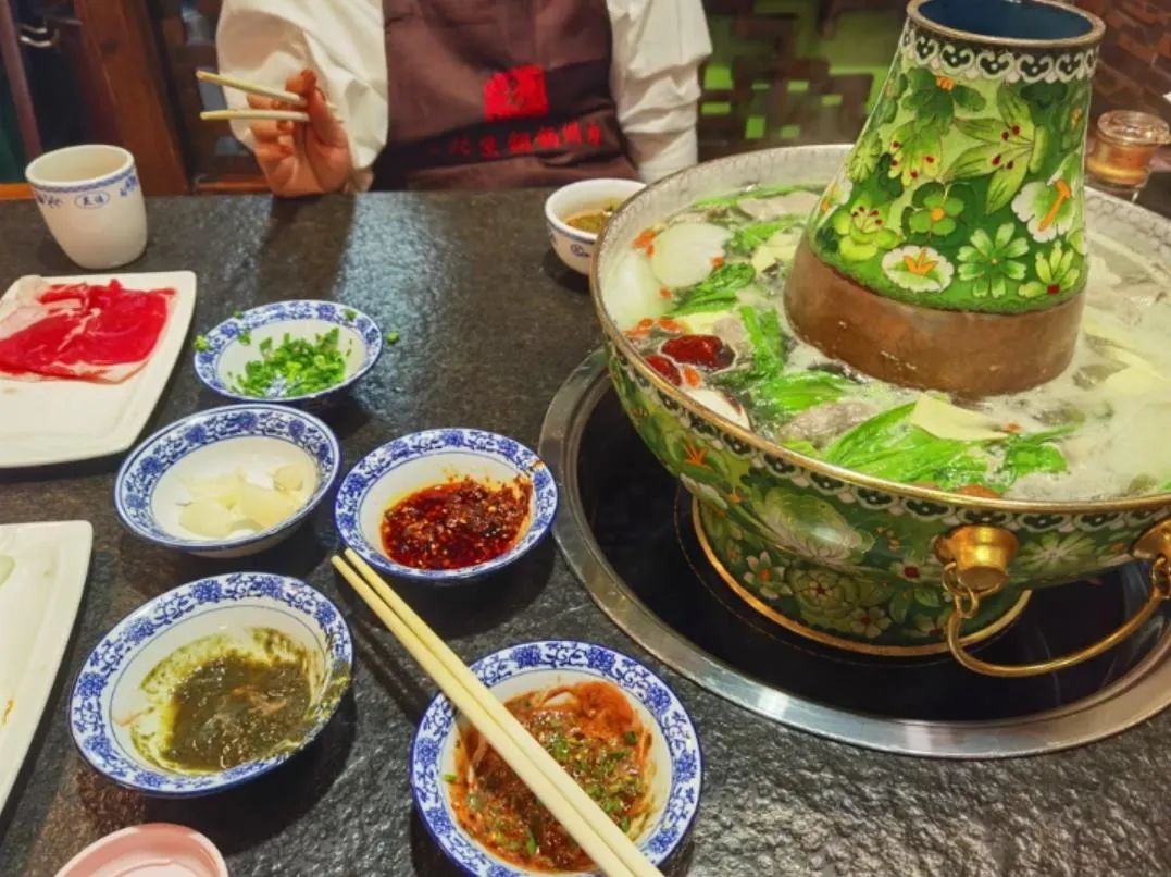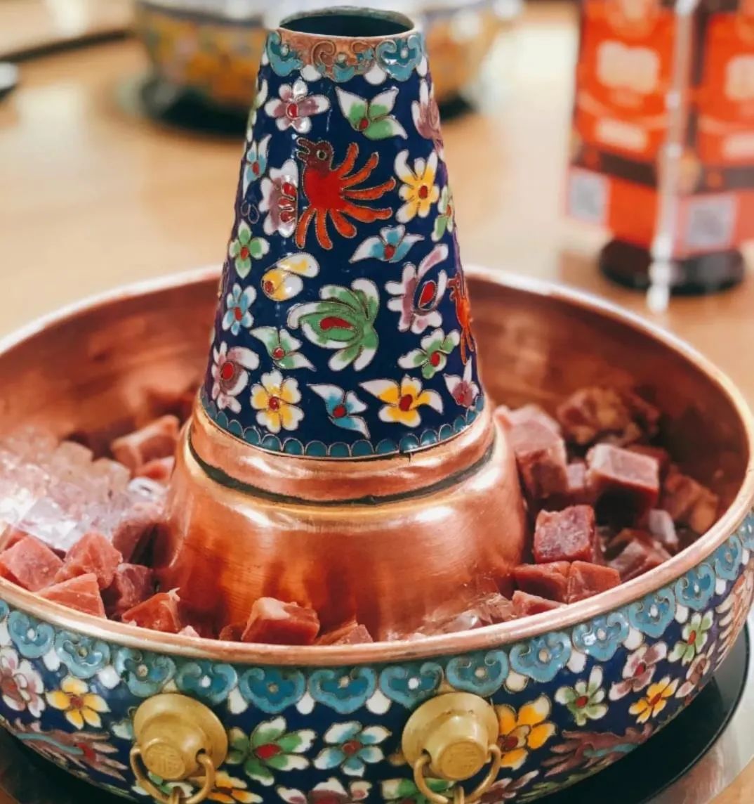 这家涮肉店完全还原了老北京, 景泰蓝珐琅锅完美突出了老北京的特色, 锅底也是延续了老北京风味用白水加八角大料等,完全保留肉和菜的原汁原味。