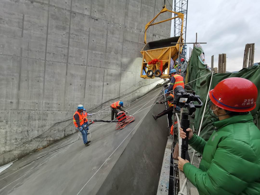 白鹤滩泄洪洞工程实现全面精品是参建者智慧和汗水的结晶。以泄洪洞龙落尾段为例,在短短的400米范围内垂直落差达到90米,并包括三种体型、四种衬砌断面,最大坡度达到23°,在如此高难度的工程部位浇筑低坍落度混凝土在行业内尚无先例,参建各方成立“党员攻关小组”积极开展技术创新,自主研发大坡度重载自动化运料系统和大坡度曲面底板常态混凝土成套施工装备,与之前已研制成功并投入使用的高边墙低坍落度上料系统、水平旋转布料系统共同构成了巨型泄洪洞全过流面低坍落度混凝土施工系列化装备,为我国水电工程装备制造带来重大革新。