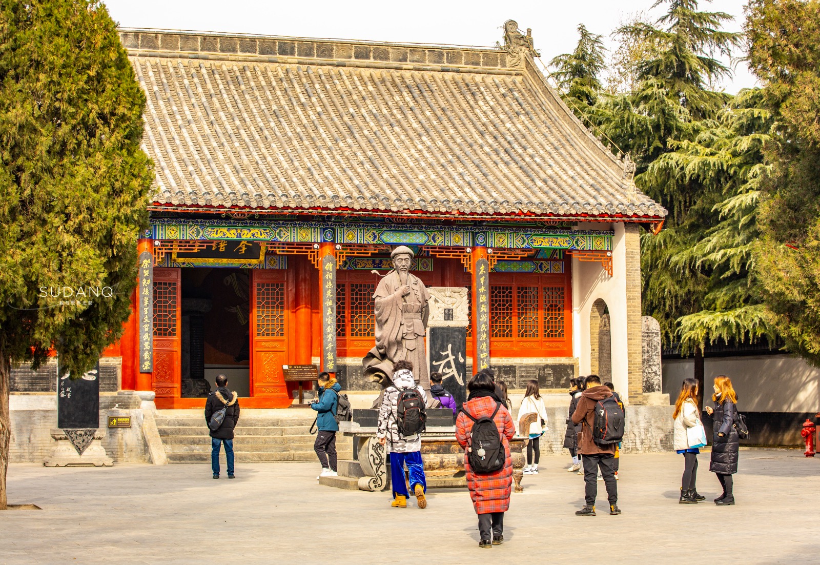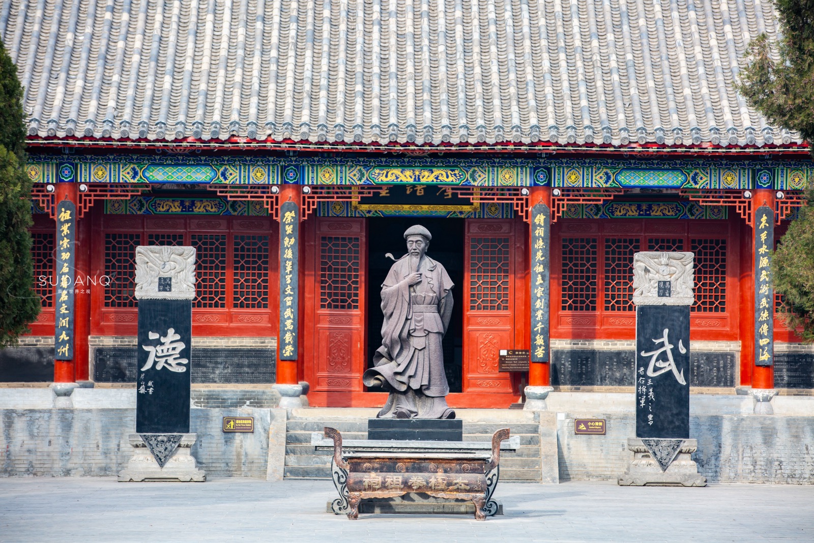 祖祠是陈式太极拳历代宗师纪念馆,太极拳鼻祖陈王廷的铜像就坐落在祖祠大院中,其身后两块石碑引人注目,令人不由想起时下网络最火的一句话:“年轻人要讲武德”。