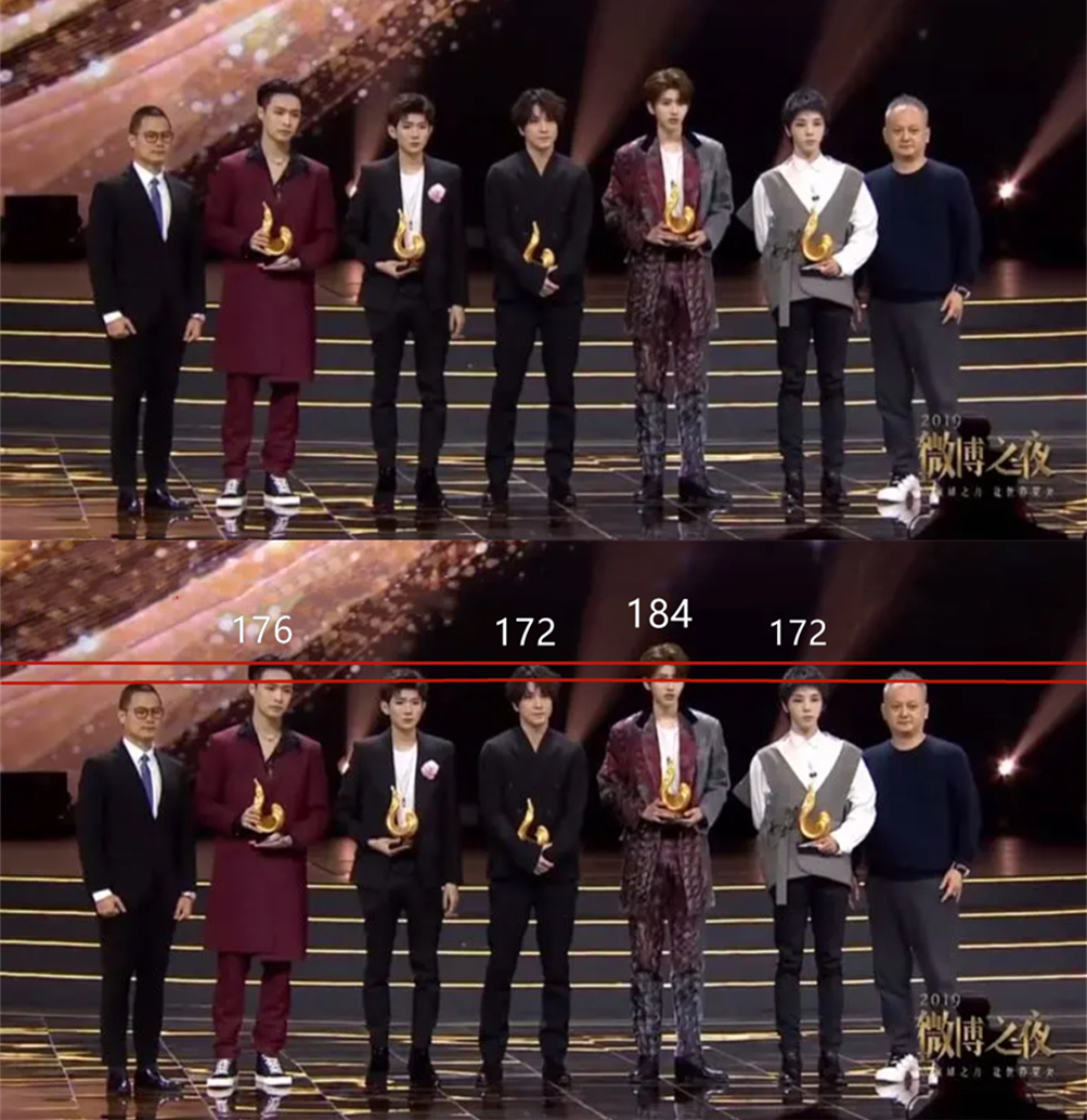 很多人会因为这样质疑张艺兴没有176cm。其实从此图来看,当时的张艺兴站姿比较倾斜,即使倾斜,也看起来要比薛之谦和华晨宇高3cm左右,所以他的身高数据应该也没有很大问题。所以华晨宇粉丝觉得他肯定是达到172cm的,不然总不能在场所有男艺人都身高造假吧?就算都造假,差距怎么能够全对得上?