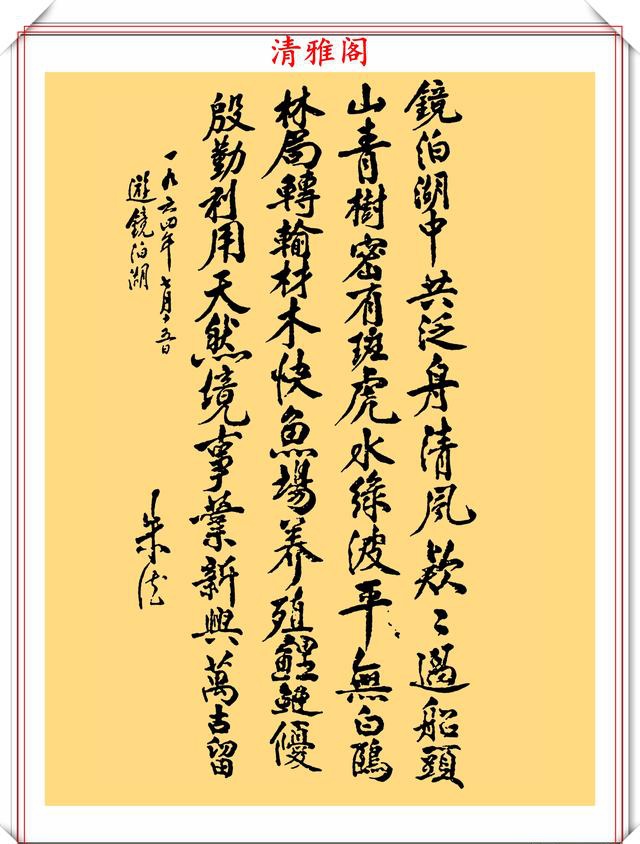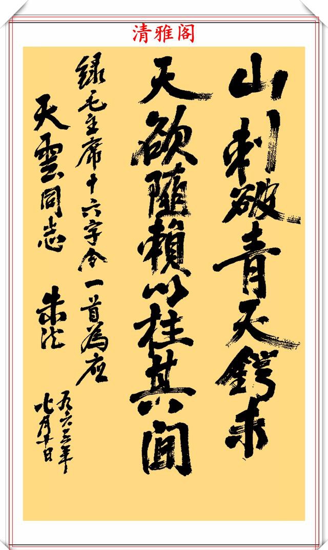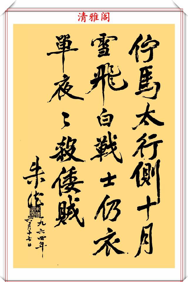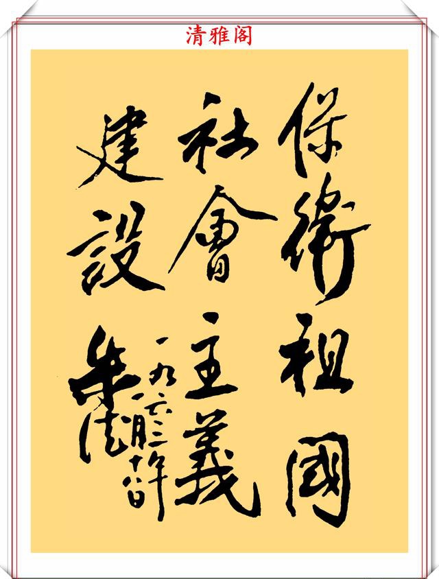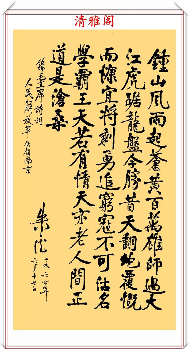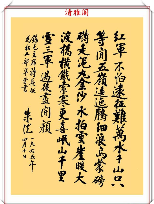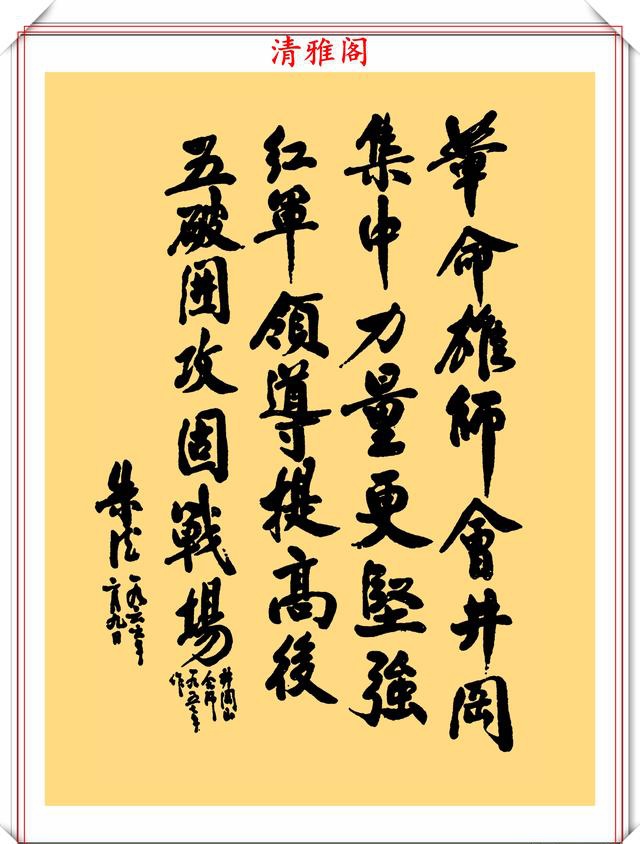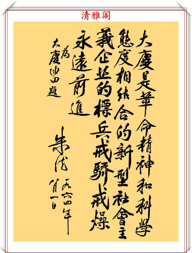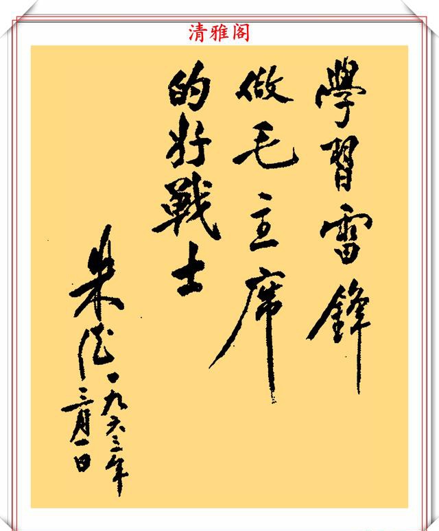 朱德元帅的书法有几分黄庭坚的格调,长枪大戟之势、敦厚沉雄之姿。每一笔都很独立,每一字都很洒脱,绝不粘连,绝不拖拽,如行云流水大江奔腾,如幽谷听琴深远恬静,整体贯穿而天成,自有真气象!文能提笔安天下,武能马上定乾坤。伟人已逝!其精神财富万古长存。朱德元帅不但是字非常的漂亮,人生的答卷也堪称完美。根据他的出身,以及戎马生涯的关境去考量,他们的字不是完美胜似完美。细看细品更是别有一番风味。灵动洒脱,气势雄健,变化多端,疾如闪电,奇如行云,韵如流水。我想,人生的阅历超高的人,才能有如此气势恢宏的书法。