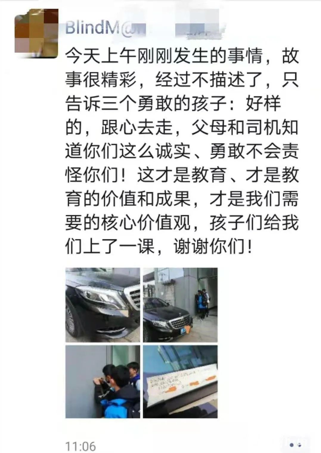 网友Blindm@n.s说“故事很精彩,经过就不描述了,只告诉三个勇敢的孩子:好样的,跟心去走,父母和司机知道你们这么诚实、勇敢不会责怪你们!这才是教育,才是教育的价值和成果,才是我们需要的核心价值观,孩子们给我们上了一课,谢谢你们!”