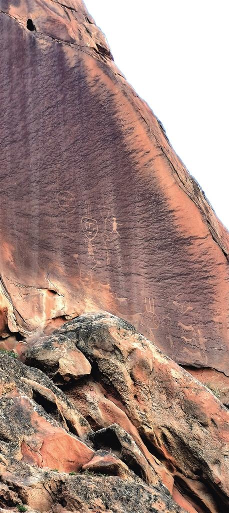 翻越一道脊梁,仍然是山路弯弯。不经意间,一块不大的峭壁出现在面前,沧桑色彩,想来时间久远。初看岩石峭壁与其他地方没有什么区别,仔细辨认,裸露的红褐色当中崖面上隐隐有纹路,果真是一幅刻有大角羊的岩画。其构造简单粗犷,古朴中带着刚健,粗犷外透露豪迈,分明是岁月千年的永恒的印记。