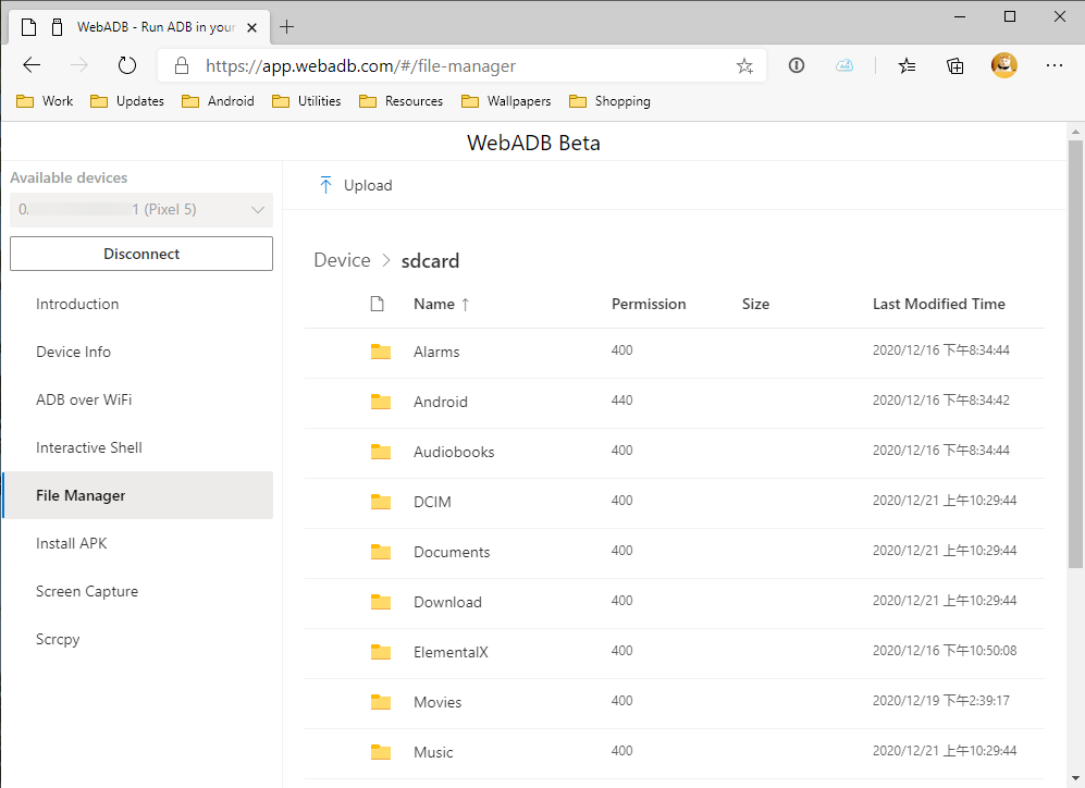 当 Available devices 下方的机型信息变灰、可操作按钮变为 Disconnect,便是连接成功了。接下来我们可以直接通过 WebADB 的网页端完成以下操作: