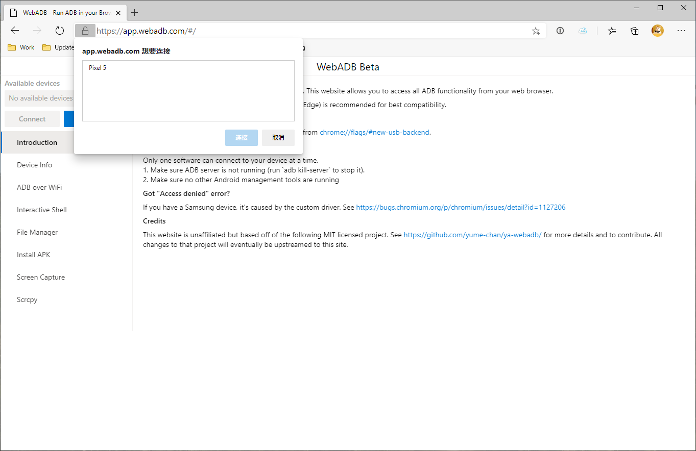 授权后 Available devices 下方便会出现设备信息,点击 Connect 便能向手机发出 USB 调试请求,此时注意通过手机上弹出的「USB 调试授权」通知。