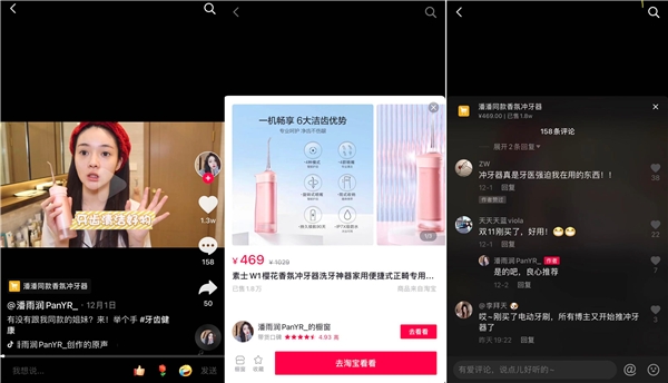 此外,抖音短视频还能通过将视频中的同款产品挂在购物车内进行销售,让主播们的抖音直播带货引流路径更短更便捷。潘雨润的不少视频就是利用了这一优势,让用户可以直接在短视频内完成下单购买的行为。12月1日,潘雨润的一条“牙齿清洁好物”分享视频中购物车内的“潘潘同款香氛冲牙器”商品已经售出近2w件。