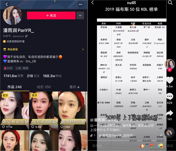 “今年秋冬最火的发色出来啦”、“一定要给你们安利的超好用的气垫”、“宝藏抗老面霜分享”,作为美妆达人的潘雨润不仅是时尚潮流风向标,还是精通各种美妆护肤的小百科。这位95后女孩以自己对美妆的热爱在抖音上成功收获168.3w粉丝,并在2019年闯入福布斯中国KOL榜单前50名。