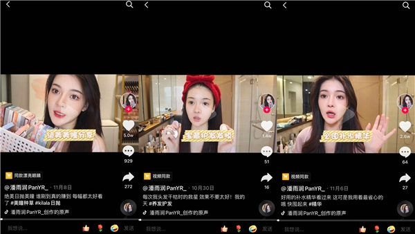 翻看潘雨润的抖音个人主页,其实她从2018年8月就在抖音上通过短视频的形式为粉丝安利各种美妆产品,这位95后女孩用自己最真实的感受为粉丝“拔草”、“种草”各种产品,并创作了点播率超高,备受粉丝团追捧的不踩雷种草视频,“绝美美瞳分享”、“必囤补水精华”、“宝藏护发发膜”…….凡是与美妆护肤相关的内容,在潘雨润的短视频中几乎都能找到你想要的信息。