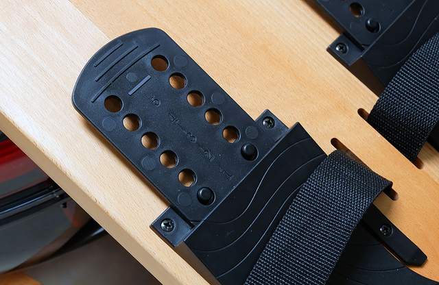 另外野小兽 R40 的脚踏采用可伸缩设计,1-6档,适合不同脚码的人群,笔者平时穿42的鞋,使用1档即可,另外脚踏上还设有松紧绑绳,如果想要进行高强度的划船训练,最好将脚与划船机绑为一体,这样就相当于自行车骑行中的脚踏,做到收发自如,快速运动,同时降低损耗,提高划船效果。