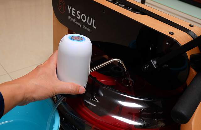 亚克力面板安装好后,下一步就是往水箱里面注水了。本次野小兽厂家为用户提供了两个注水附件:漏斗和抽水泵,无论使用哪个都可以实现水箱注水。水箱的注水口设计的比较靠里面,可能是厂家考虑到整个划船机的美观性,水箱塞采用软硬适中的橡胶塞设计,取下的时候需要用很大的力气,可见它的密封性还是非常强的。