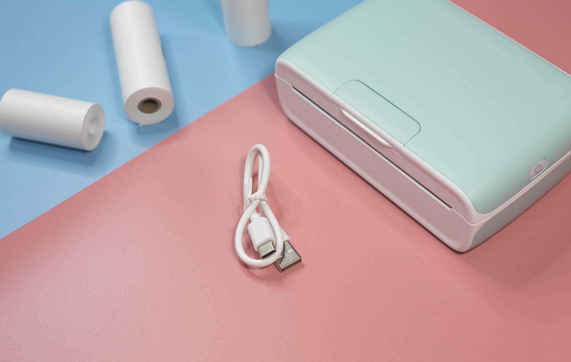 看一下印先森的所有零配件:印先森M04S宽幅打印机、使用说明书、充电线及打印纸。这里特别要说一下的是,M04S这个型号的印先森是支持53mm、80mm、110mm三种尺寸的打印纸,所以能够根据情况使用不同尺寸的打印纸。