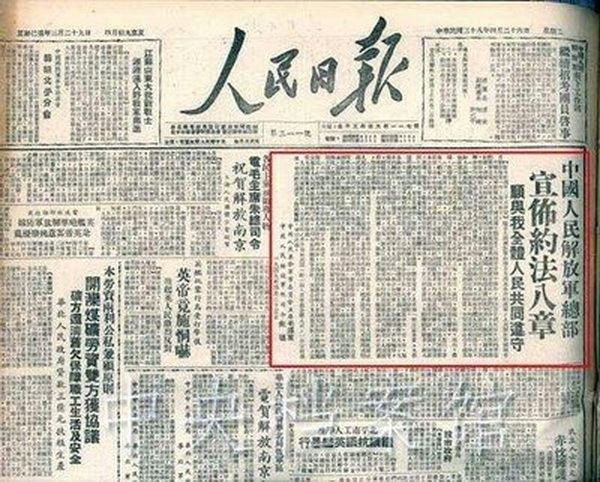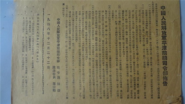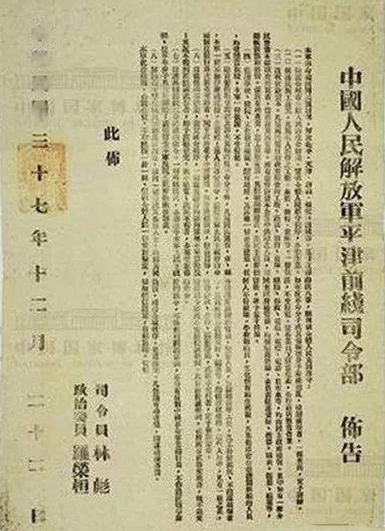 就在人民解放军,以“摧枯拉朽”的态势即将取得决定性胜利的时候,1948年12月22日,人民解放军平津前线司令部发布约法八章: