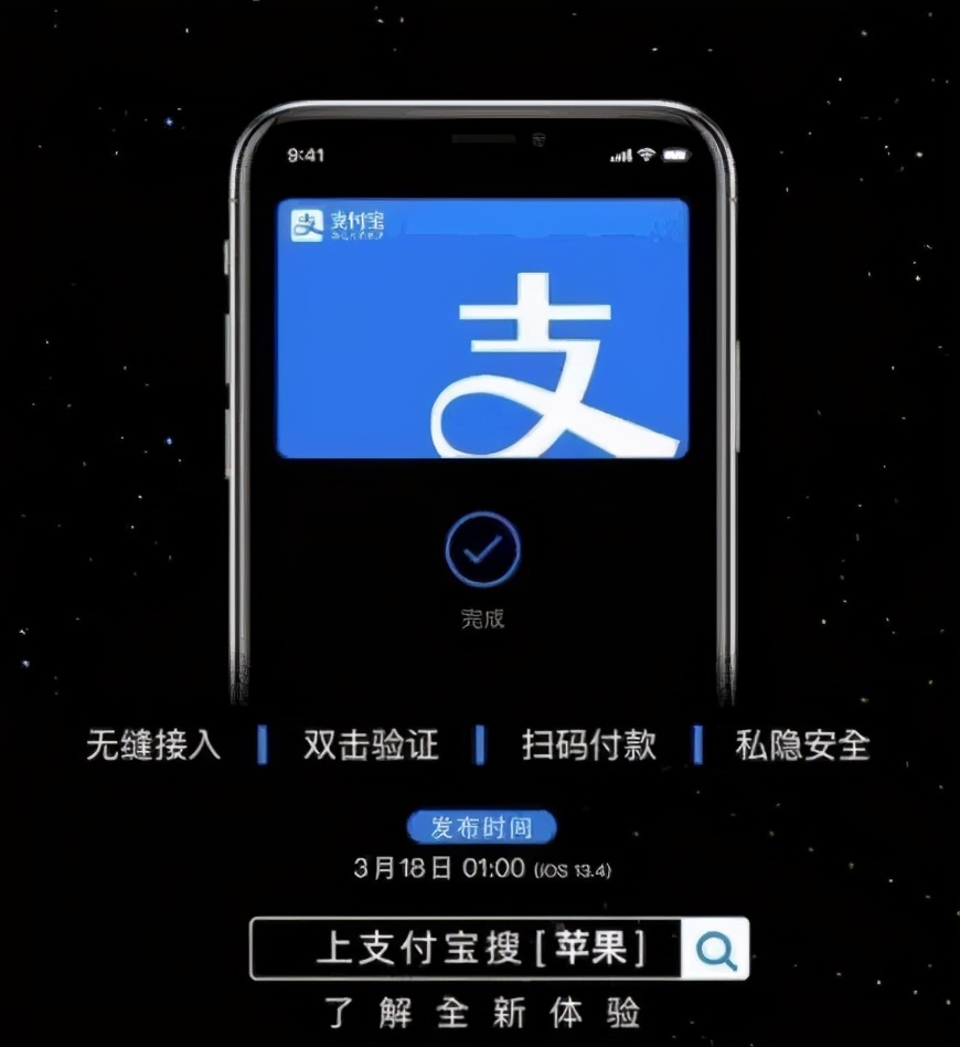 关于 Apple Pay 接入支付宝消息,今天又有了,但不知道真假,毕竟视频而我又没有看到,仅看到图片而已,在早期iOS 13.4的时候,有网友发现一张宣传 Apple Pay 支付宝图片。