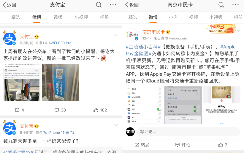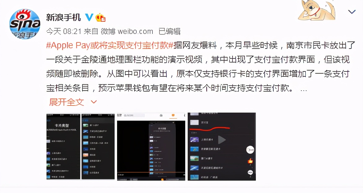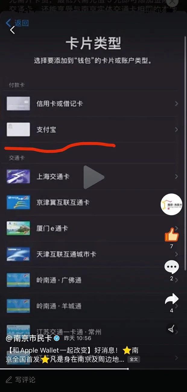该消息来源于微博南京市民卡一段宣传 Apple Pay 金陵通交通卡视频,其中视频就显示了付款卡中有支付宝,所以消息就这么传出来了,不过!作者发现后,然后把宣传视频删除了,又被部分[神之手]铁汁发现后截图传播这件事。