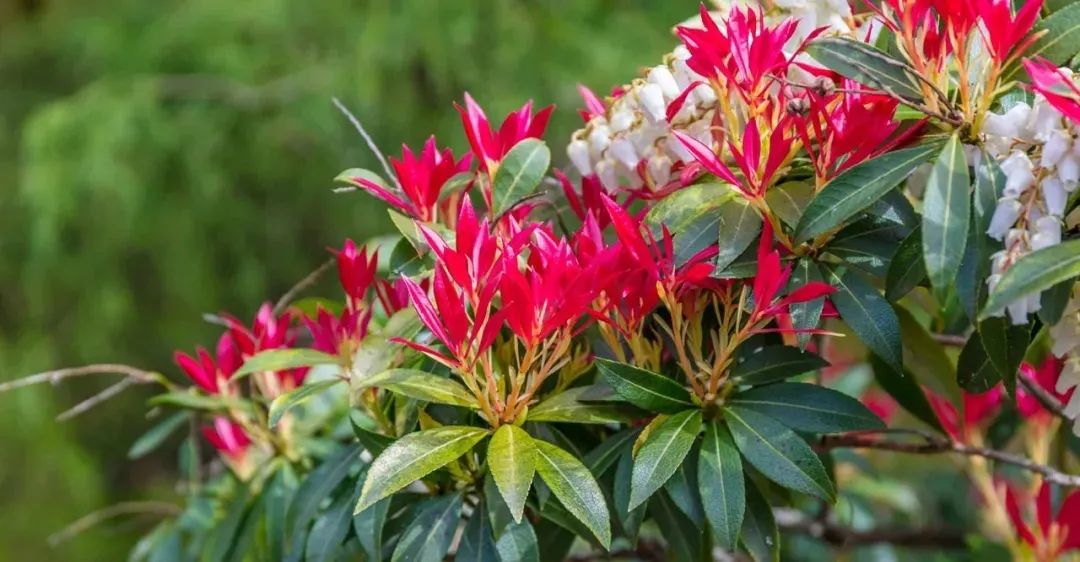 马醉木的嫩叶呈红色,看起来像燃烧的火焰一般,而花朵像一个个小铃铛,长成一串串的小铃铛,看着就特非常迷人(4~5月开花)。