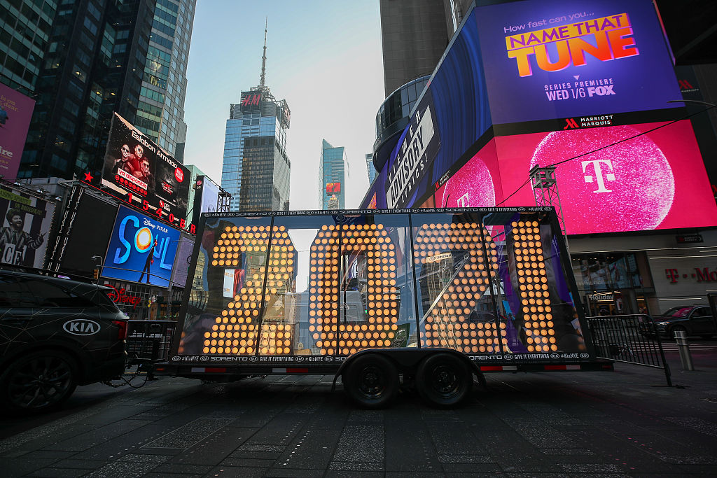 当地时间2020年12月21日,美国纽约,2021新年倒计时装置抵达纽约时报广场,现场吸引大量民众和媒体人士。人们在2021年数字前拍照。(来源:视觉中国)