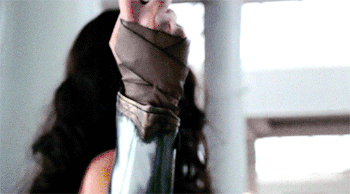 戴安娜额头上戴的发箍/发带,可以当成回形标一样的武器使用,这跟70年代美剧中的设定很像。不过这一部里面她的剑和盾去哪儿了?