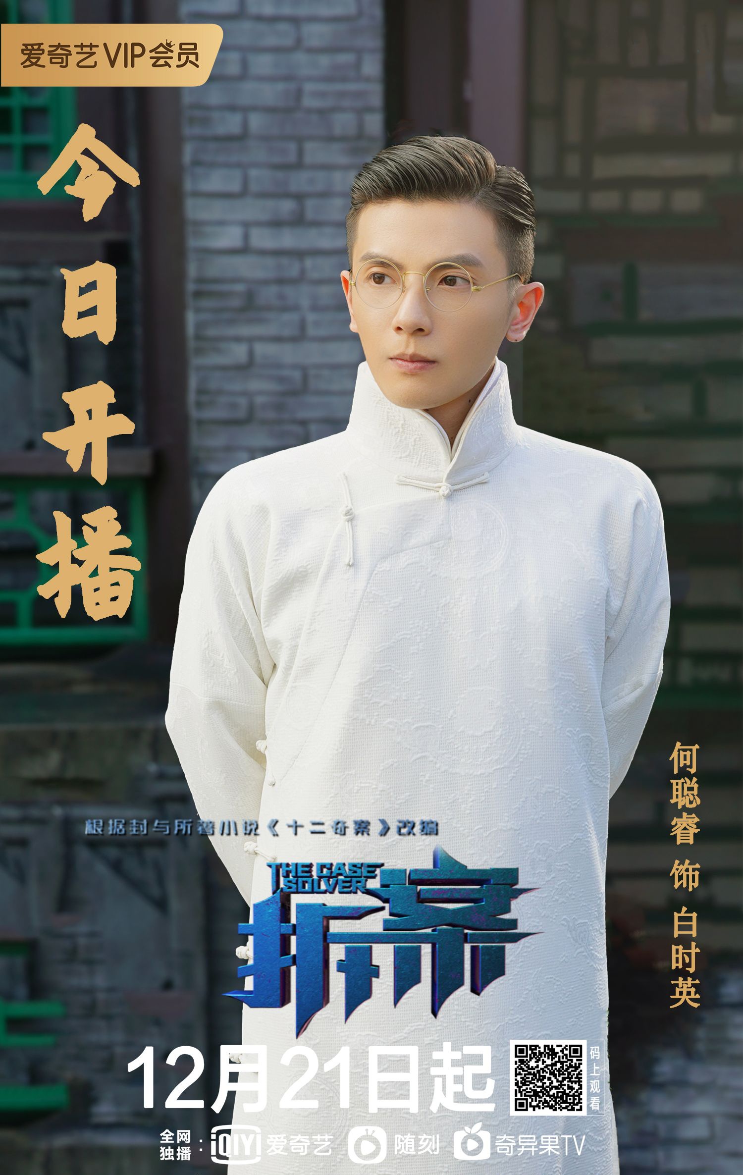 《拆案》改编自封与原创小说《十二奇案》,而何聪睿饰演的白时英作为剧中开篇案件的主人公,金边眼镜,白色长袍,说话慢条斯理,气质温文尔雅,其翩翩贵公子的民国造型,一出场就令观众眼前一亮。