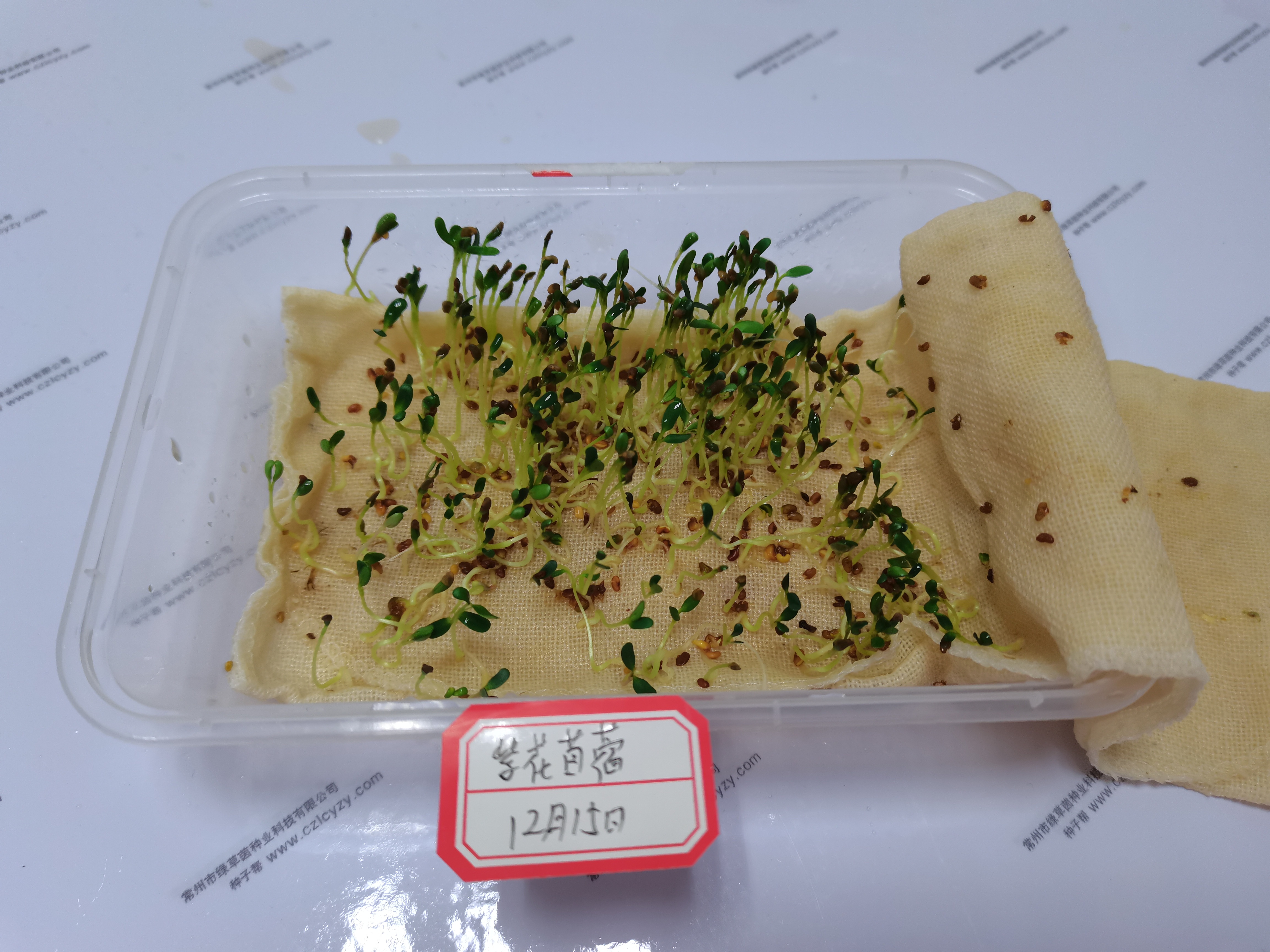 从图片可以看出,在12.10号就开始发芽,此时,大多数种子都已经出芽,出芽率良好。12.11号苗逐渐长大。接下来几天,种子发芽情况越发茁壮,长势良好。一周后,幼芽基本长齐,普遍在1cm以上。