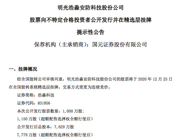 挖贝网 12月22日,浩淼科技(831856 )确定将于12月25日挂牌精选层,保荐机构国元证券。