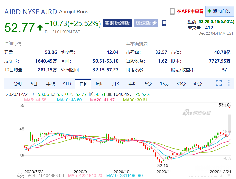 Aerojet股价大涨10.73美元,至52.77美元,涨幅25.5%。洛克希德股价下滑6.68美元,至349.35美元,跌幅为1.8%,使得这家全球最大的国防承包商的市值接近980亿美元。