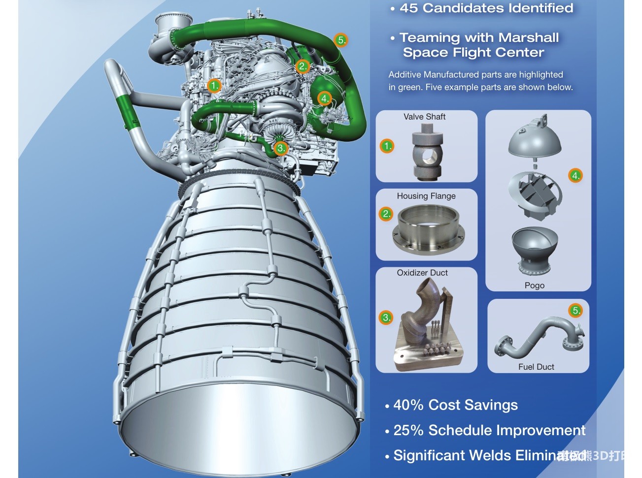 △Aerojet Rocketdyne的火箭发动机,使用增材制造生产重启引擎上的某些零件,除了此处所示的动力头零件以外,还采用了现代制造技术来生产新的主燃烧室和喷嘴