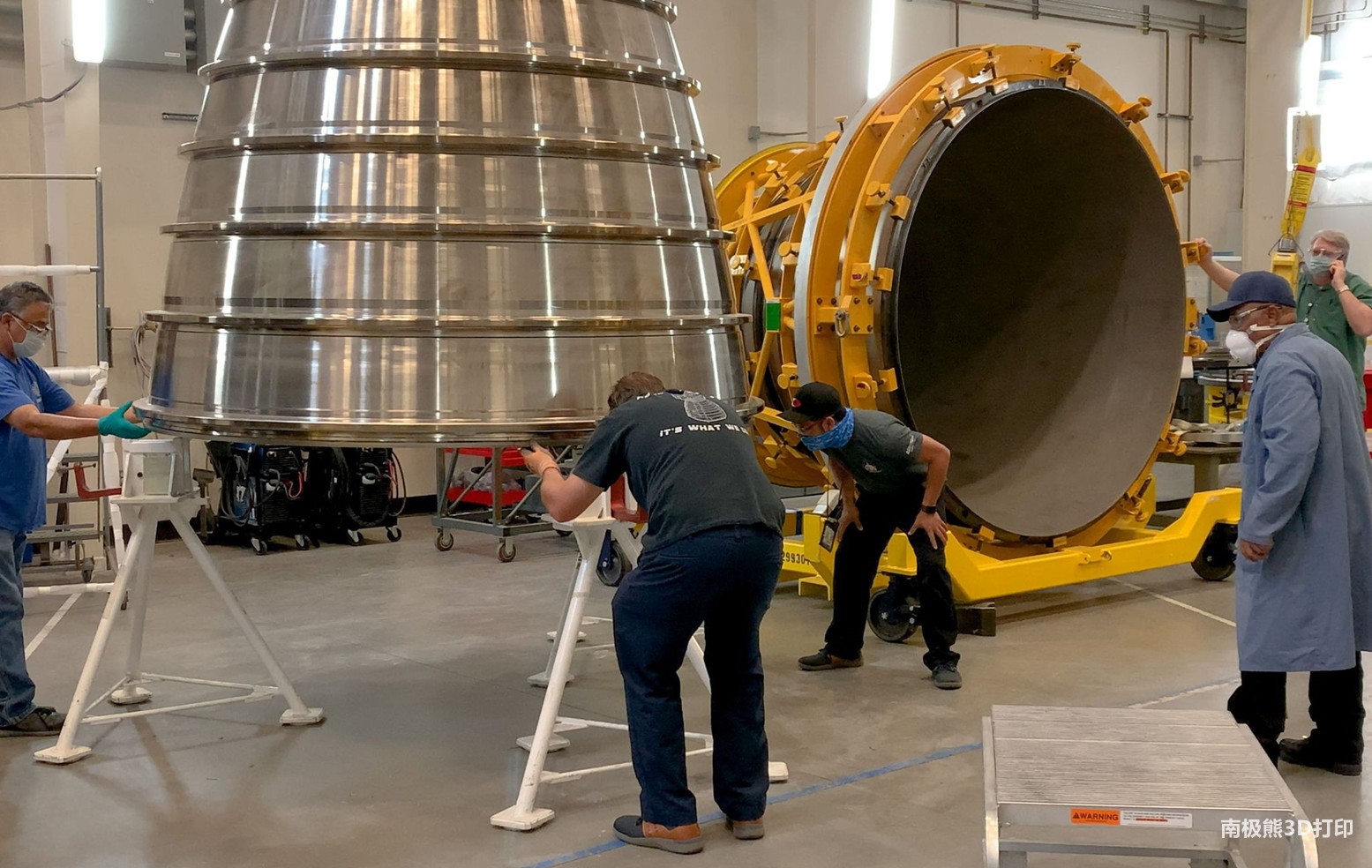 △Aerojet 工厂里RS-25发动机组件的喷嘴套。重启生产后,喷嘴套的生产进行了现代化改造,零件数量从几十个减少到了四个。在喷嘴组件的生产中,将一千多个冷却管精确地布置在护套的内部,然后用钎焊工艺将它们融合在一起