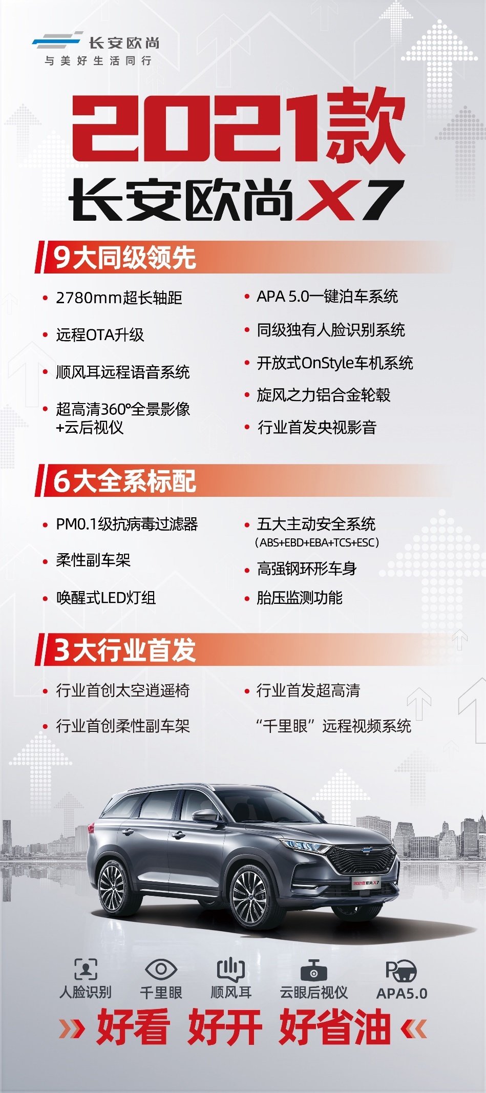 2021款长安欧尚X7专为当红一代顾家进取族的用车需求而来,以“好看、好开、好省油”——新三好生的姿态,为客户带来舒适驾驭享受。