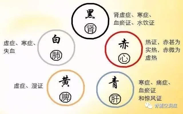 5.黑色:主肾虚证、寒证、痛证、瘀血证、水饮证。寒证、痛证、瘀血证由于肾阳虚衰,水饮不化,血行不畅,故面呈黑色。眼眶周围发黑为痰饮证。