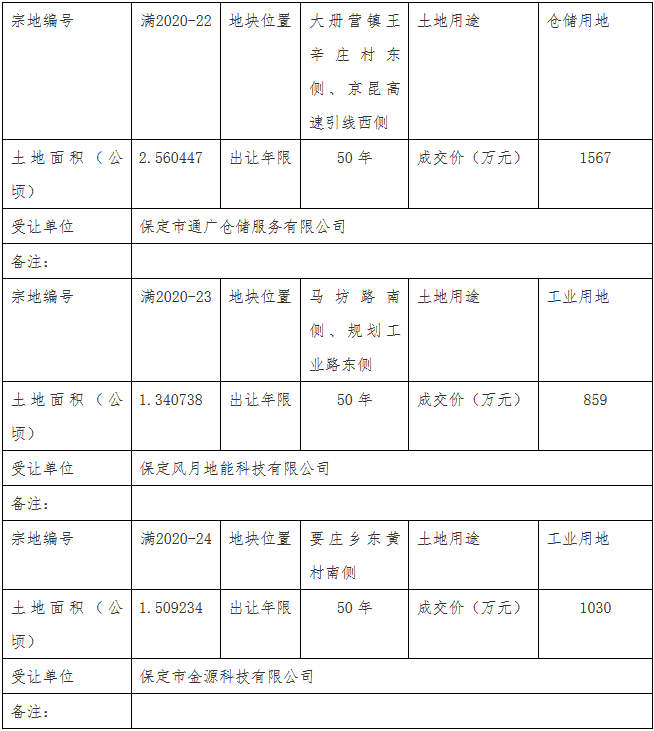 保定市自然资源和规划局满城区分局国有土地使用权招拍挂出让成交公示 2020-06