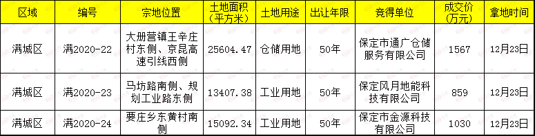 2020年12月23日河北省公共资源交易平台公布保定市满城区土地出让结果公告,共计3宗地块,2宗工业用地,1宗仓储用地,共计54104.19平方米,约合81.16亩。