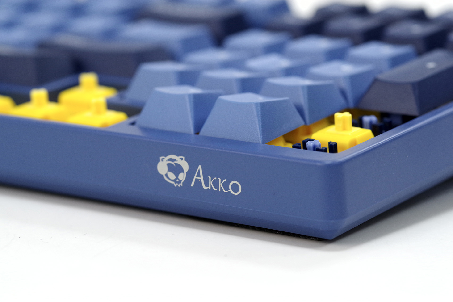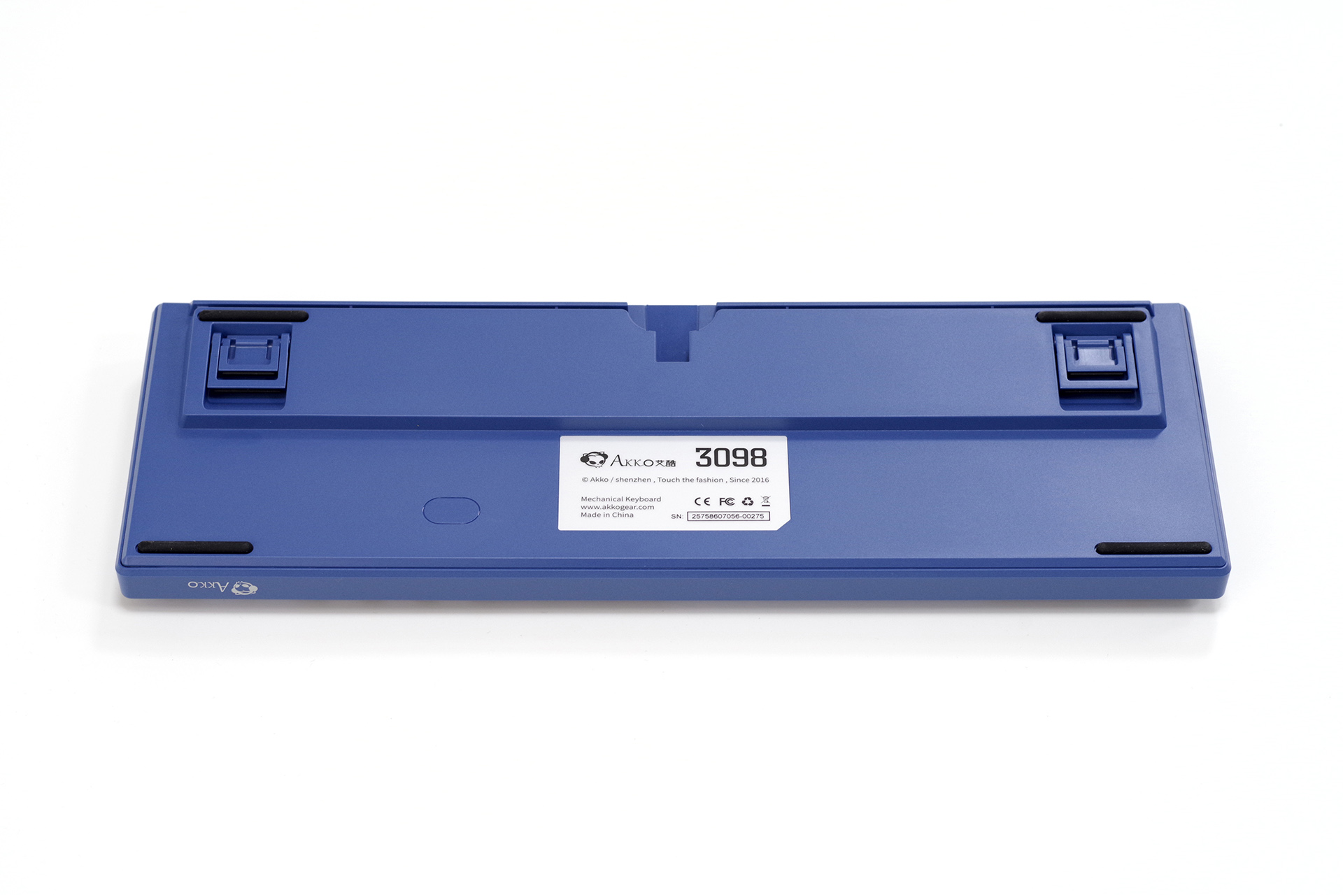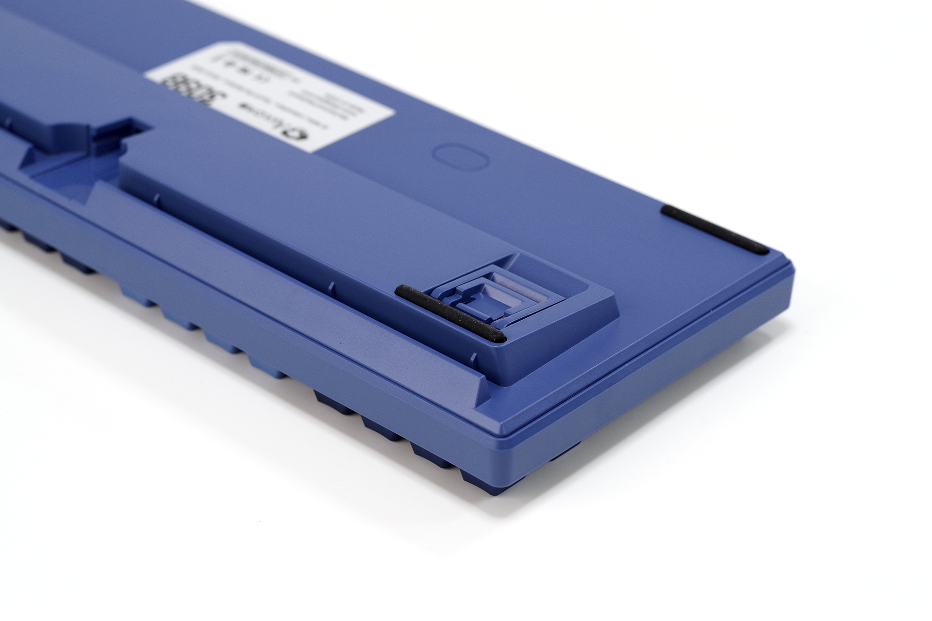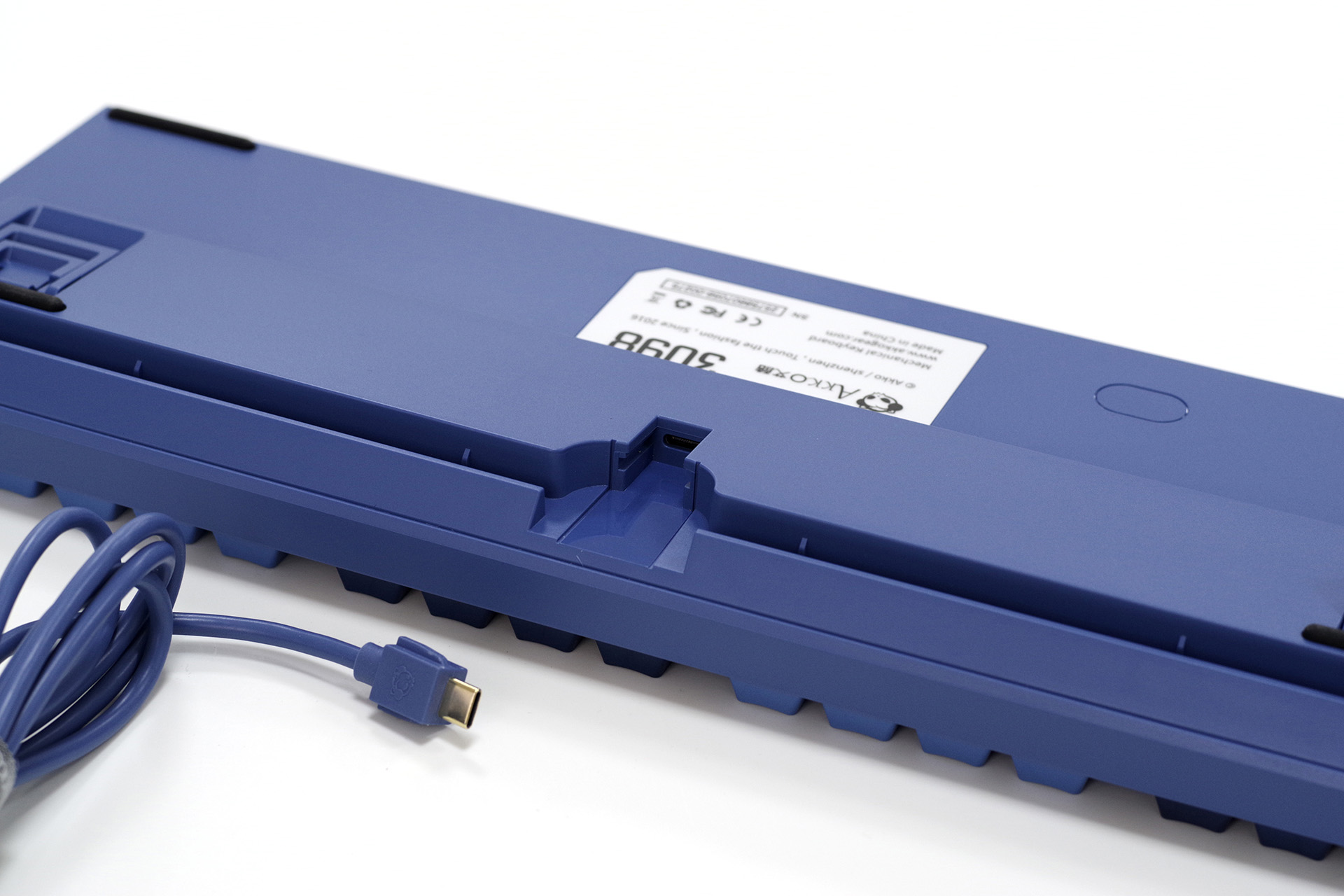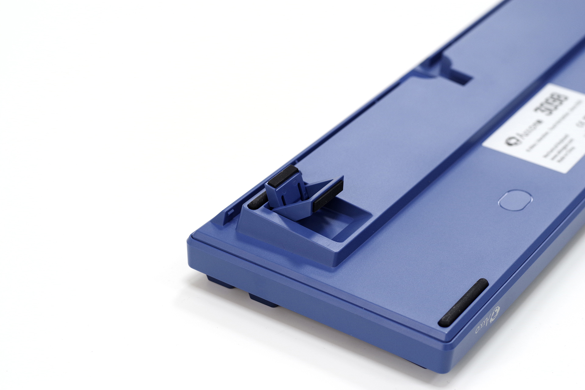 底盘Akko祖传棱线简约设计,三出线、四防滑、二段撑脚,主防滑垫是半圆柱形的,撑脚上也附加了防滑垫片。出线口有加固设计,无正反之分,走线槽为两端侧出线。