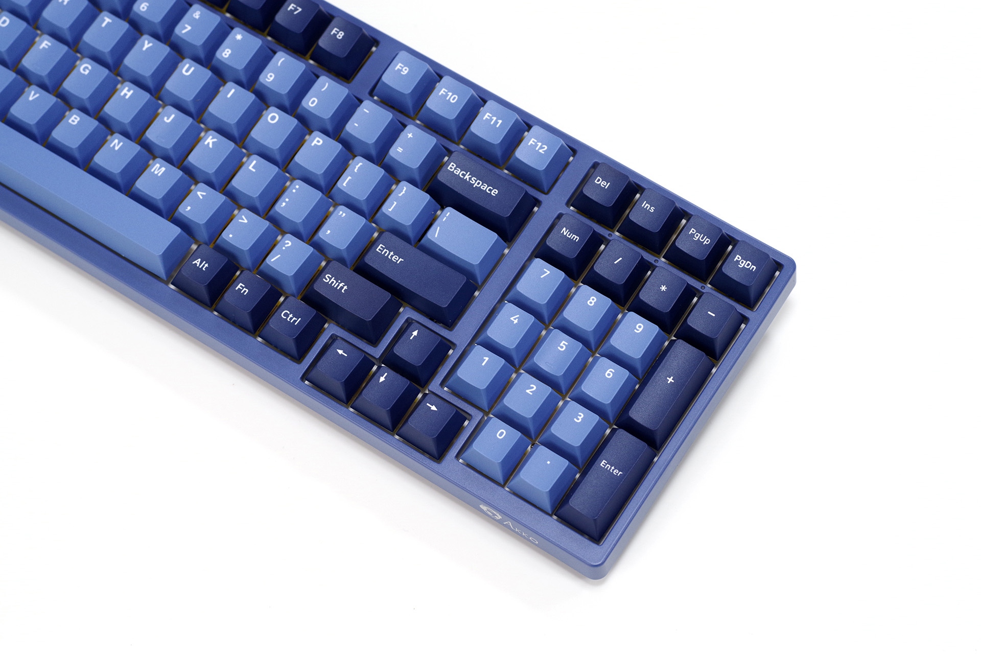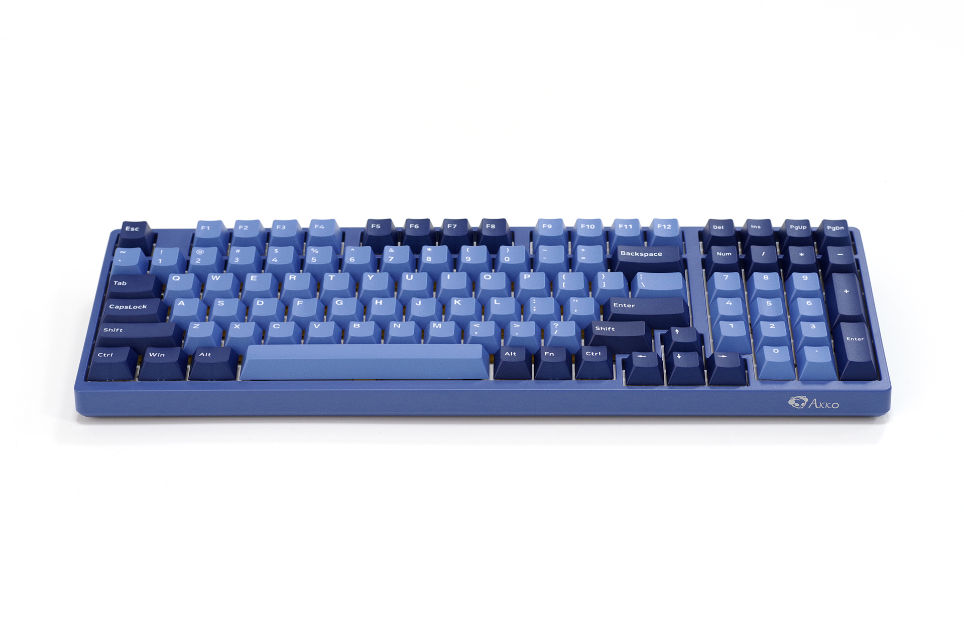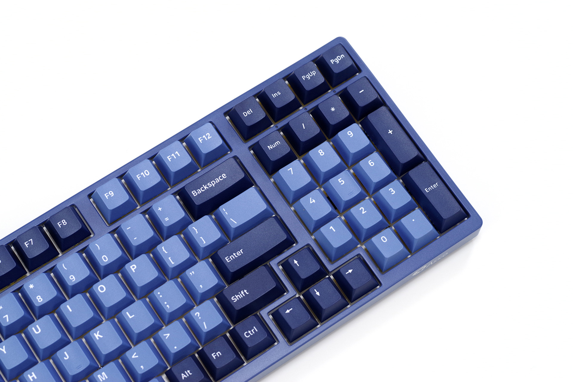 键盘本体,98键布局,窄边造型,三阶蓝色的“海洋之心”主题色。