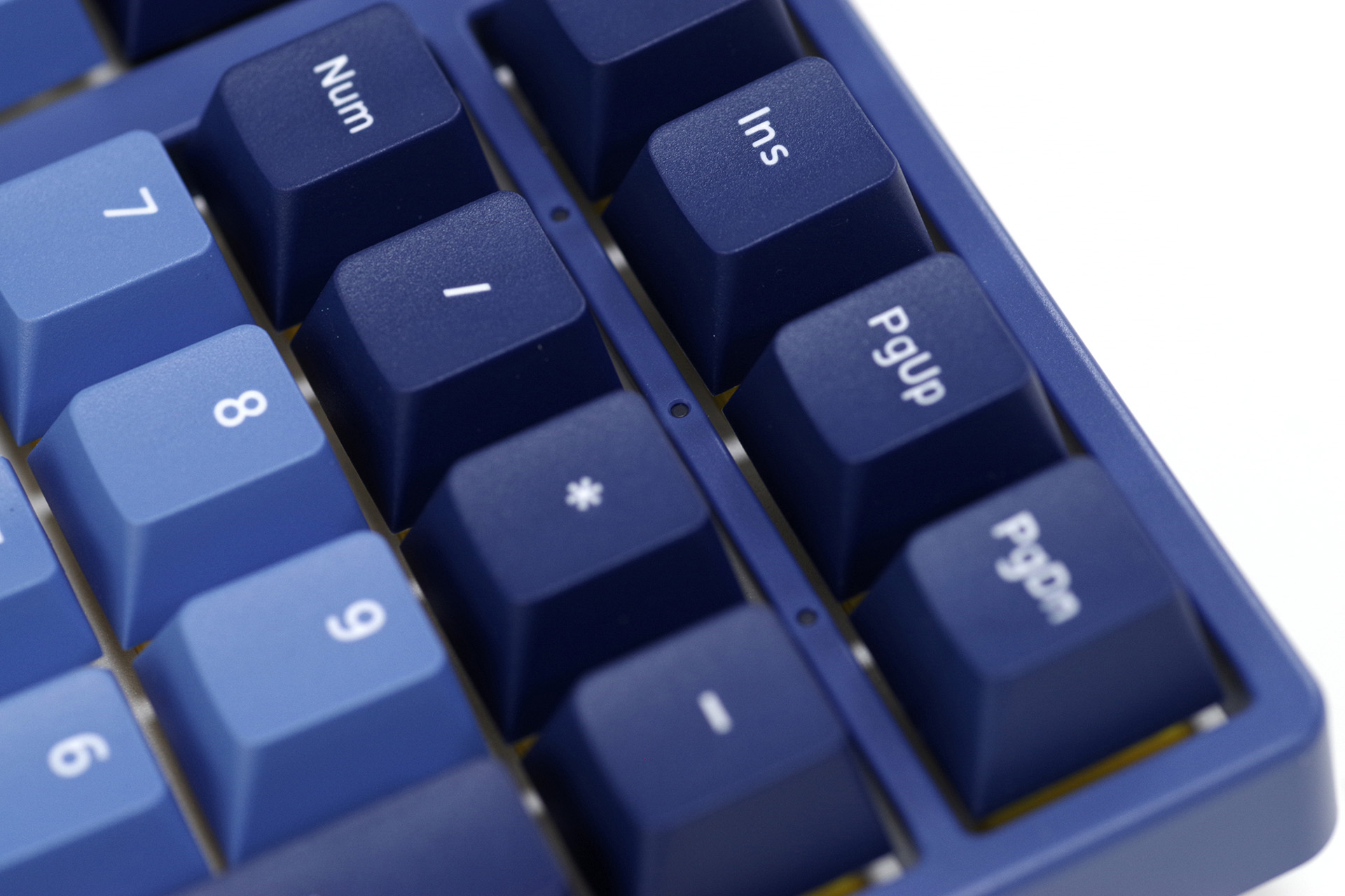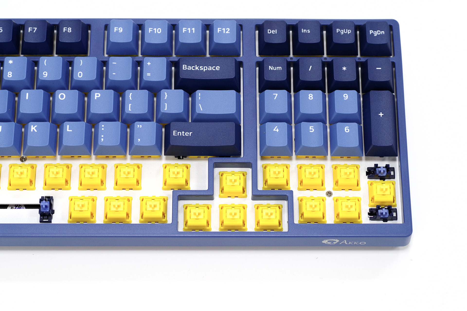 R1空格行左侧三键是1.25×宽度,右侧则是1×,R Shift是2×,主键区基本与84、96配列一致,一定程度上也优化了对第三方键帽的兼容性(不会出现很特殊的增补键需求),再考虑到Akko深厚的自产键帽群,可以说对后续玩键帽这个方面3098还是照顾得不错的。嵌入到主键区与数字区之间的方向键,边框形成标志性的“凸”字样,边框宽度与F区、主键区间隔宽度一致,增加了整体外观的统一性。