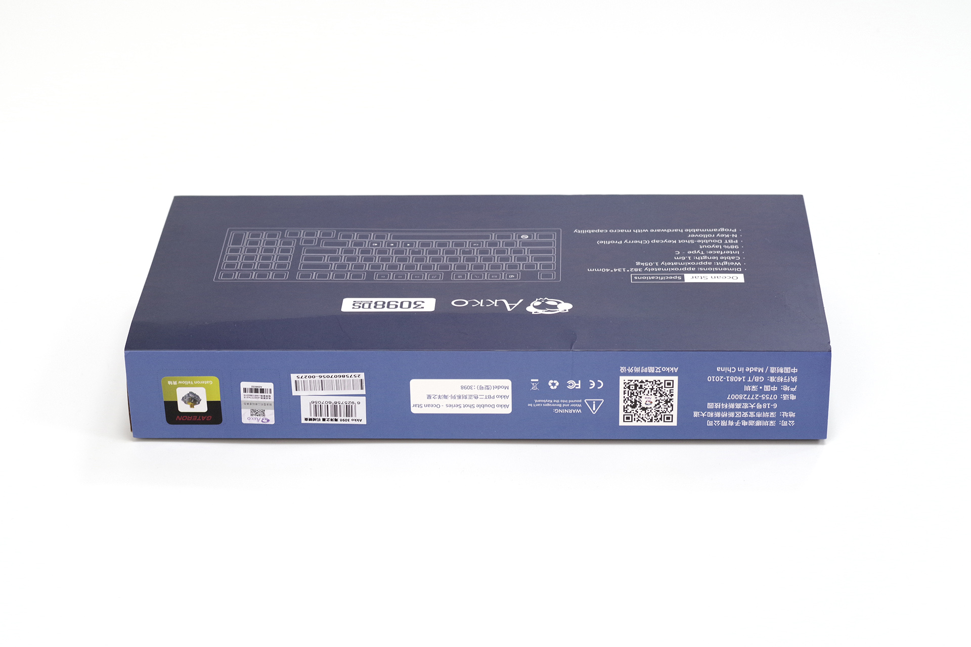 外包装家族传统封套+内胆盒,非常简约的图案印刷设计,正面是渲染图,标注“Akko 3098 DS Ocean Star”,其中DS表示Double Shot双色成型键帽工艺。背面是配列图,侧面贴了轴型。