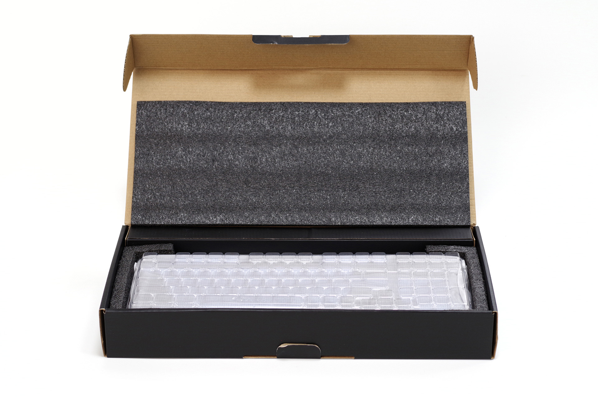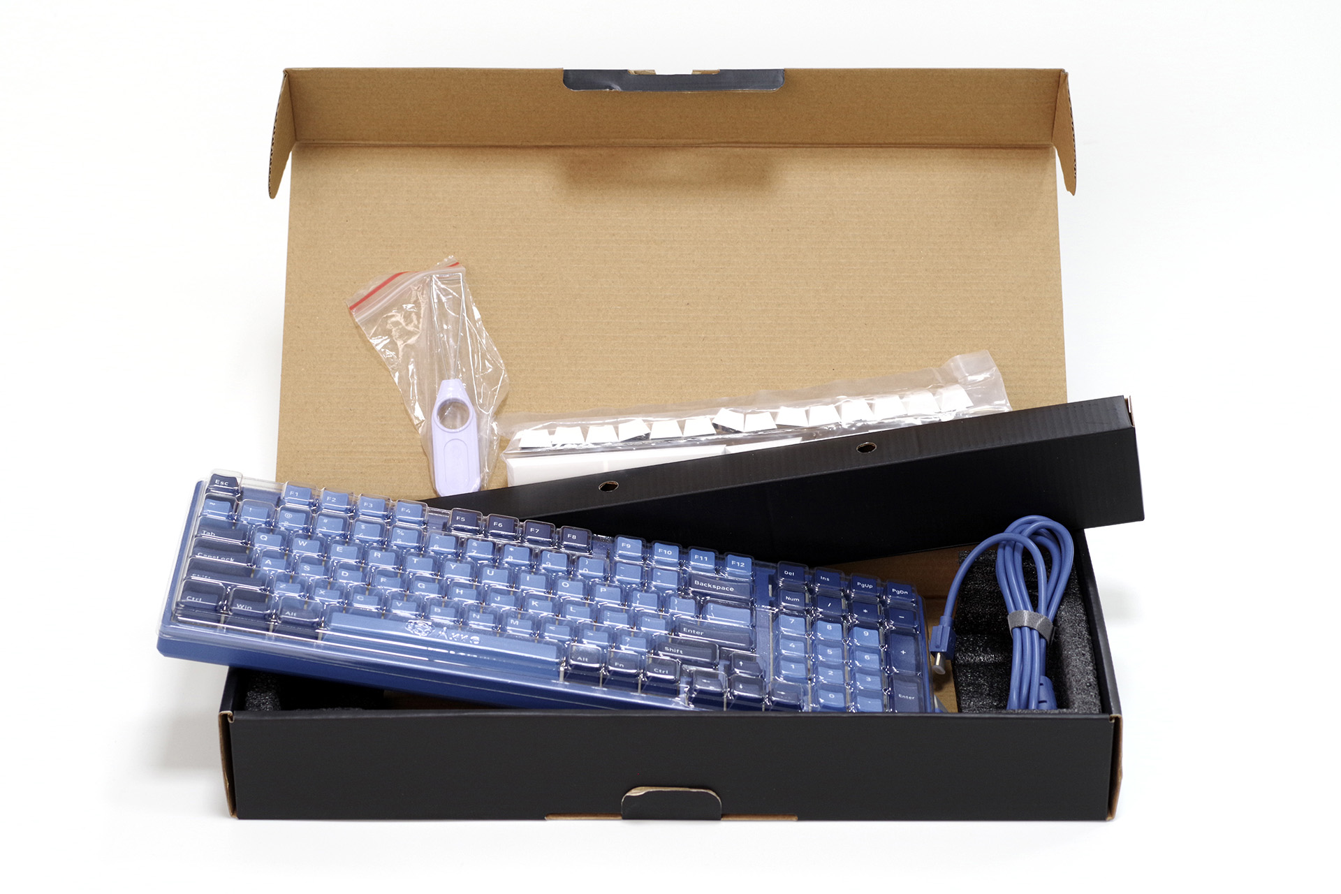 内部增加了EPE四面缓冲,防护效果更加出色。附带防尘罩,配件放置在顶部长条盒子中,包含拔键器、Type-C键盘线和20颗自定义替换键帽。